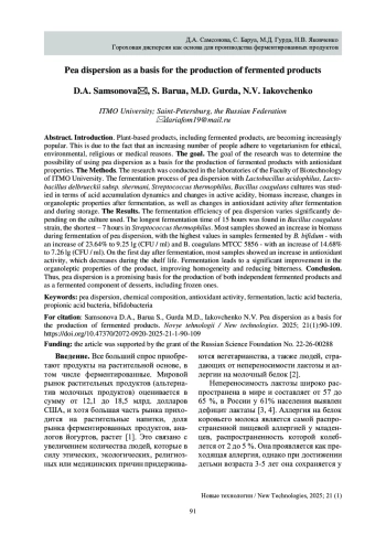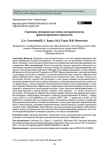 Заключение. Таким образом, гороховая дисперсия представляет собой перспективную основу для производства как самостоятельных ферментированных продуктов, так и в качестве ферментированного компонента десертов, в том числе замороженных.