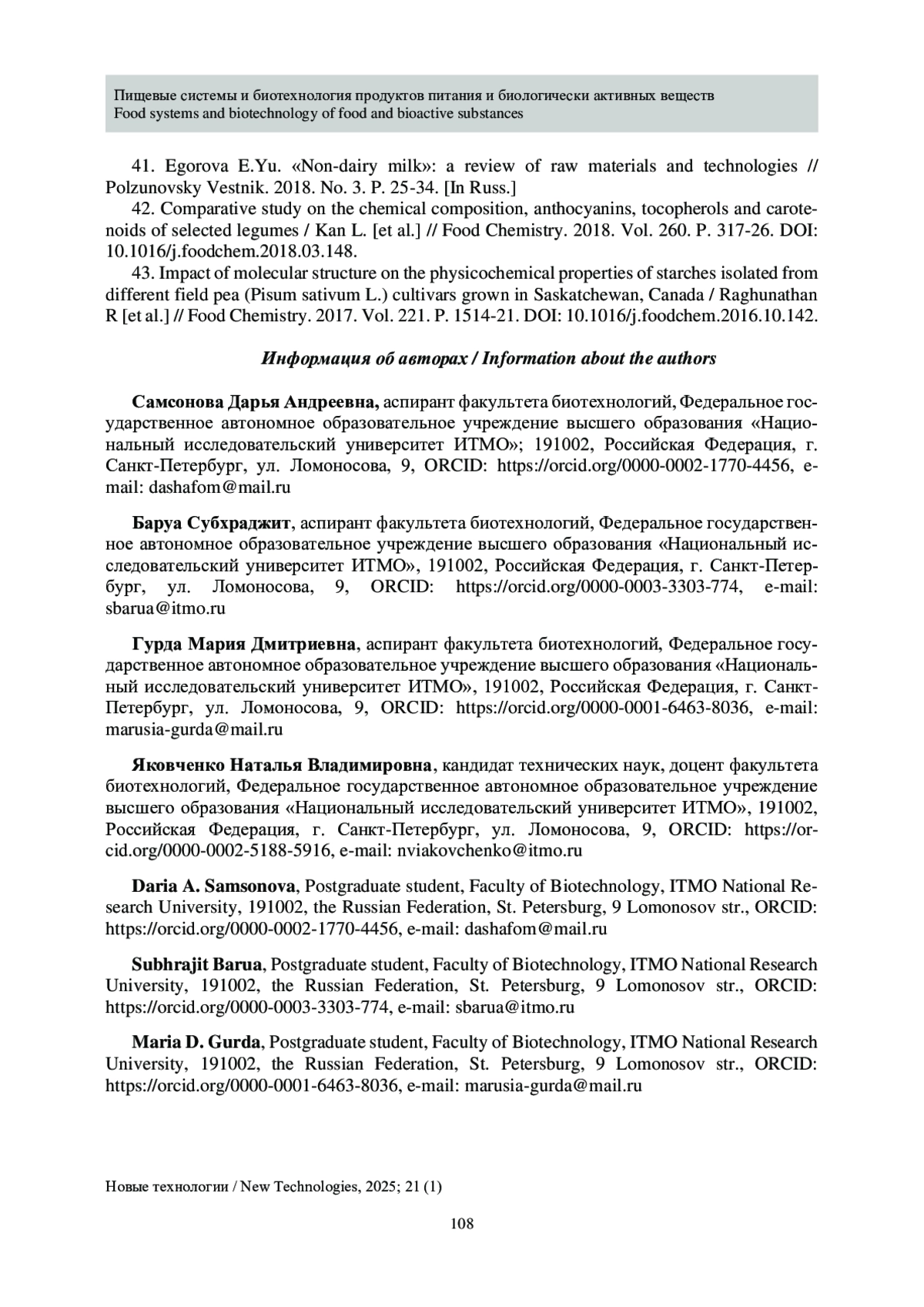40. Developments in the isolation, composition, and physicochemical properties of legume starches / Ashogbon A.O. [et al.] // Critical Reviews in Food Science and Nutrition. 2020. P. 1-22. https://doi.org/10.1080/10408398.2020.1791048.
