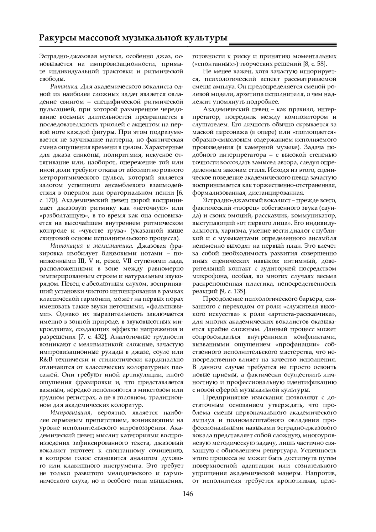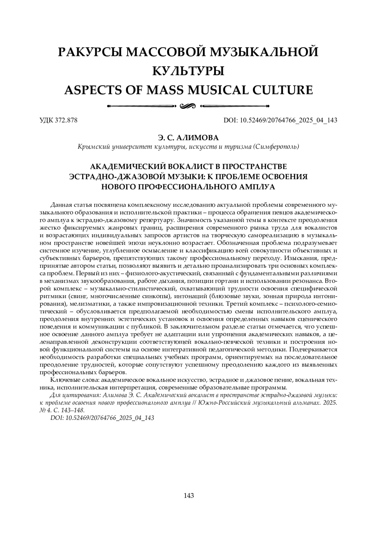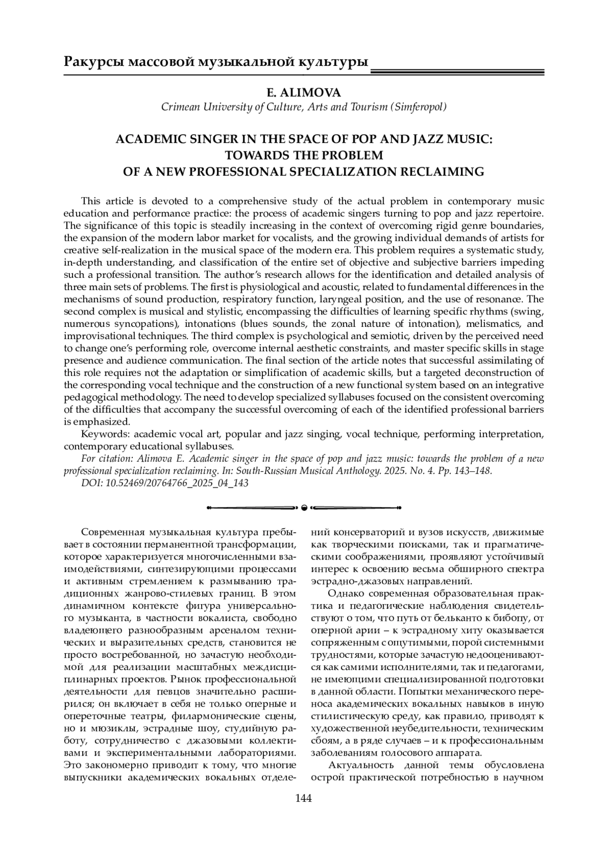 Данная статья посвящена комплексному исследованию актуальной проблемы современного музыкального образования и исполнительской практики - процесса обращения певцов академического амплуа к эстрадно-джазовому репертуару. Значимость указанной темы в контексте преодоления жестко фиксируемых жанровых границ, расширения современного рынка труда для вокалистов и возрастающих индивидуальных запросов артистов на творческую самореализацию в музыкальном пространстве новейшей эпохи неуклонно возрастает. Обозначенная проблема подразумевает системное изучение, углубленное осмысление и классификацию всей совокупности объективных и субъективных барьеров, препятствующих такому профессиональному переходу. Изыскания, предпринятые автором статьи, позволяют выявить и детально проанализировать три основных комплекса проблем. Первый из них - физиолого-акустический, связанный с фундаментальными различиями в механизмах звукообразования, работе дыхания, позиции гортани и использовании резонанса. Второй комплекс - музыкально-стилистический, охватывающий трудности освоения специфической ритмики (свинг, многочисленные синкопы), интонаций (блюзовые звуки, зонная природа интонирования), мелизматики, а также импровизационной техники. Третий комплекс - психолого-семиотический - обусловливается предполагаемой необходимостью смены исполнительского амплуа, преодоления внутренних эстетических установок и освоения определенных навыков сценического поведения и коммуникации с публикой. В заключительном разделе статьи отмечается, что успешное освоение данного амплуа требует не адаптации или упрощения академических навыков, а целенаправленной деконструкции соответствующей вокально-певческой техники и построения новой функциональной системы на основе интегративной педагогической методики. Подчеркивается необходимость разработки специальных учебных программ, ориентируемых на последовательное преодоление трудностей, которые сопутствуют успешному преодолению каждого из выявленных профессиональных барьеров.