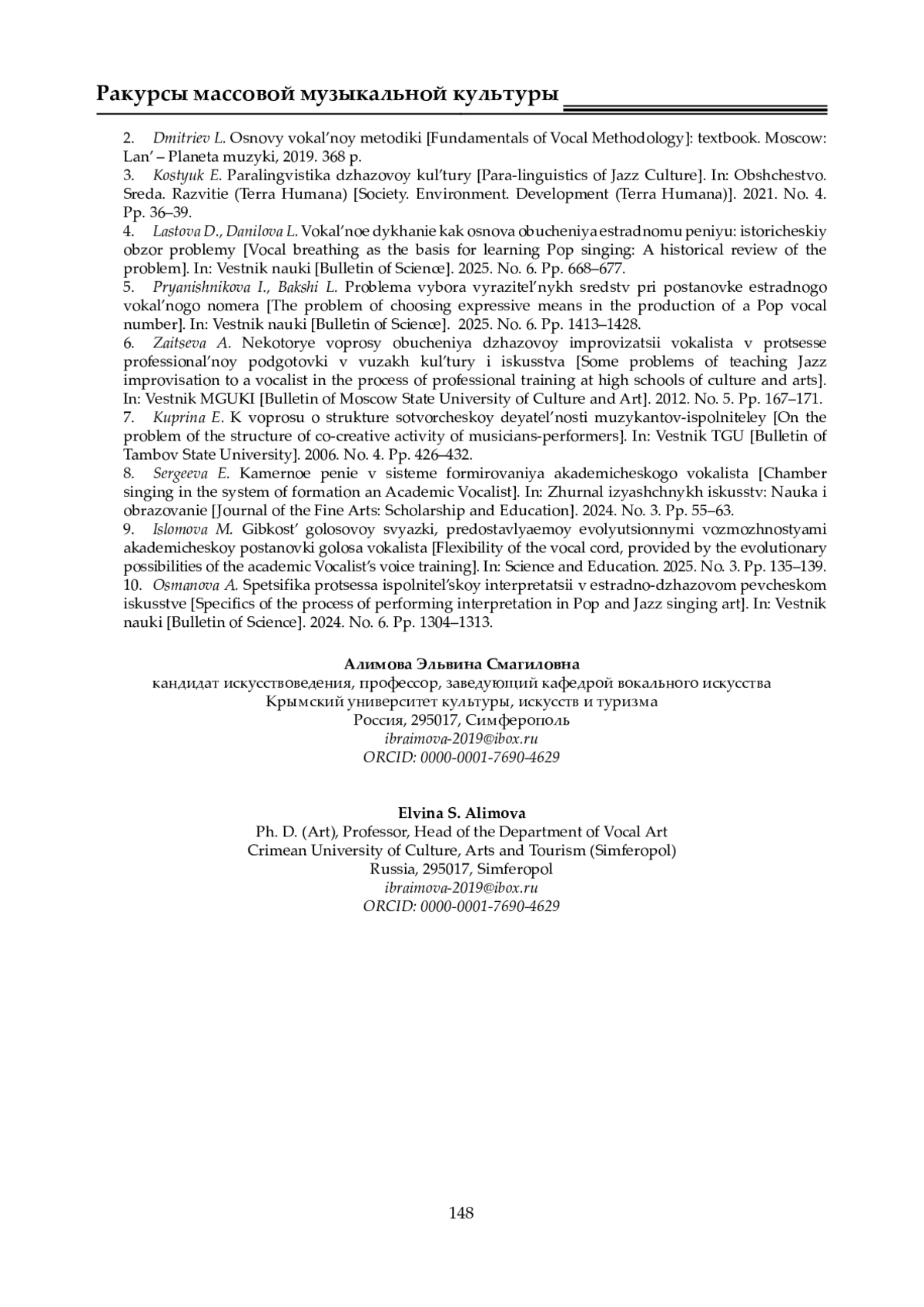 4. Ластова Д. Д., Данилова Л. В. Вокальное дыхание как основа обучения эстрадному пению: исторический обзор к проблеме // Вестник науки. 2025. № 6. С. 668-677.