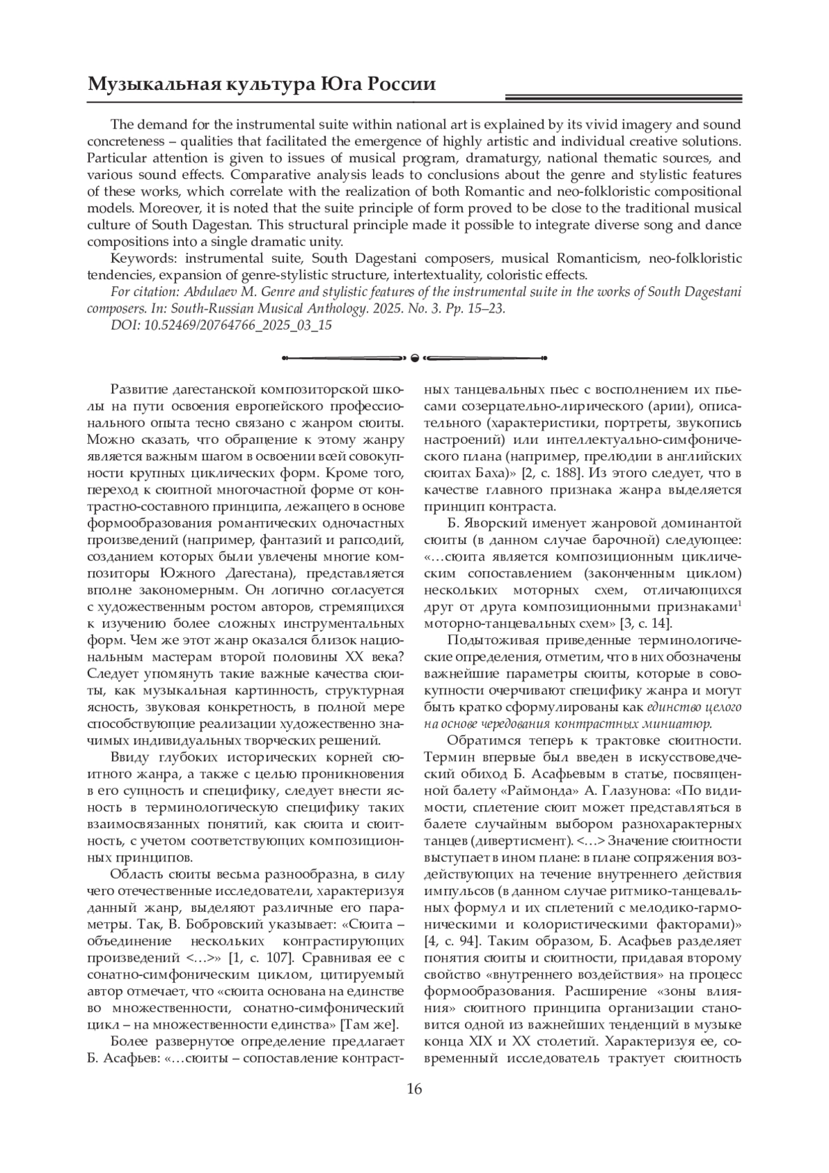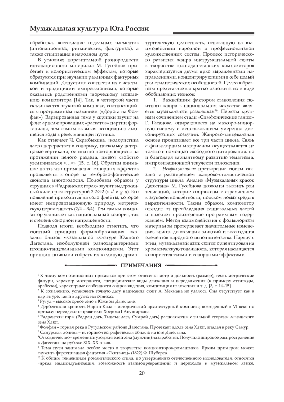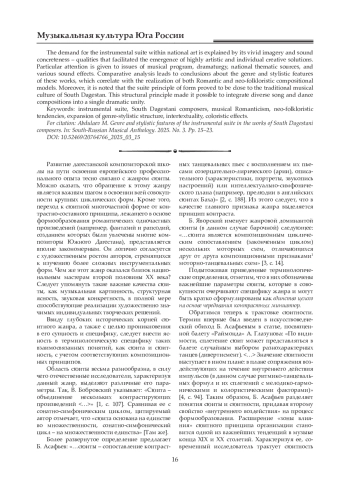 Статья посвящена становлению и развитию жанра инструментальной сюиты в творчестве композиторов Южного Дагестана. Автор выделяет два этапа в развитии жанра: первый связан с фортепианными сюитами Готфрида Гасанова (1950, 1952), второй - с появлением его «Симфонических танцев» (1963), оказавших огромное влияние на творчество последующих композиторов, создавших ряд сюит для оркестра дагестанских народных инструментов. Среди них - «Даргинские эскизы» С. Керимова, «Рутульские эскизы» М. Гусейнова, а также две сюиты А. Мехмана. В этих сочинениях проявилась тенденция усложнения музыкального языка за счет применения оригинальных тембровофактурных решений. В статье отмечаются новаторские черты «Музыкальных красок Дагестана» М. Гусейнова, связанные с расширением жанрово-стилистической структуры цикла, а также многообразием подходов к разработке фольклорного материала. Композитор использует свободную обработку первоисточника, стилизацию, воссоздает отдельные элементы народного исполнительства. Востребованность инструментальной сюиты в национальном искусстве обусловливается музыкальной картинностью и звуковой конкретностью. Именно эти качества в полной мере способствовали появлению высокохудожественных индивидуальных творческих решений. Особое внимание при их характеристике уделено проблемам музыкальной программности, драматургии, национальным истокам тематизма, а также различным звуковым эффектам. В процессе сравнительного анализа сделаны выводы о жанровых и стилистических особенностях произведений, которые коррелируют с претворением романтической и неофольклорной композиционных моделей. Кроме того, отмечается, что сюитный принцип формообразования оказался близок традиционной музыкальной культуре Южного Дагестана. Данный структурный принцип позволил интегрировать в единую драматургическую целостность разнохарактерные песенно-танцевальные композиции.