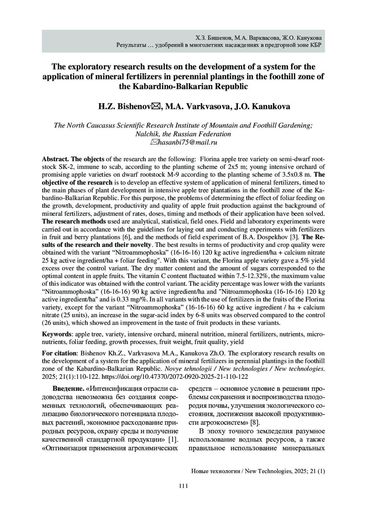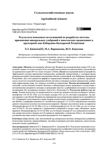 Целью исследований является разработка эффективной системы применения минеральных удобрений, приуроченных к основным фазам развития растений в интенсивных насаждениях яблони в предгорной зоне Кабардино-Балкарской Республики. Для этого решаются задачи по определению влияния на рост, развитие, продуктивность и качество плодовой продукции яблони листовых подкормок на фоне минеральных удобрений; корректировка норм, доз, сроков и способов их применения.