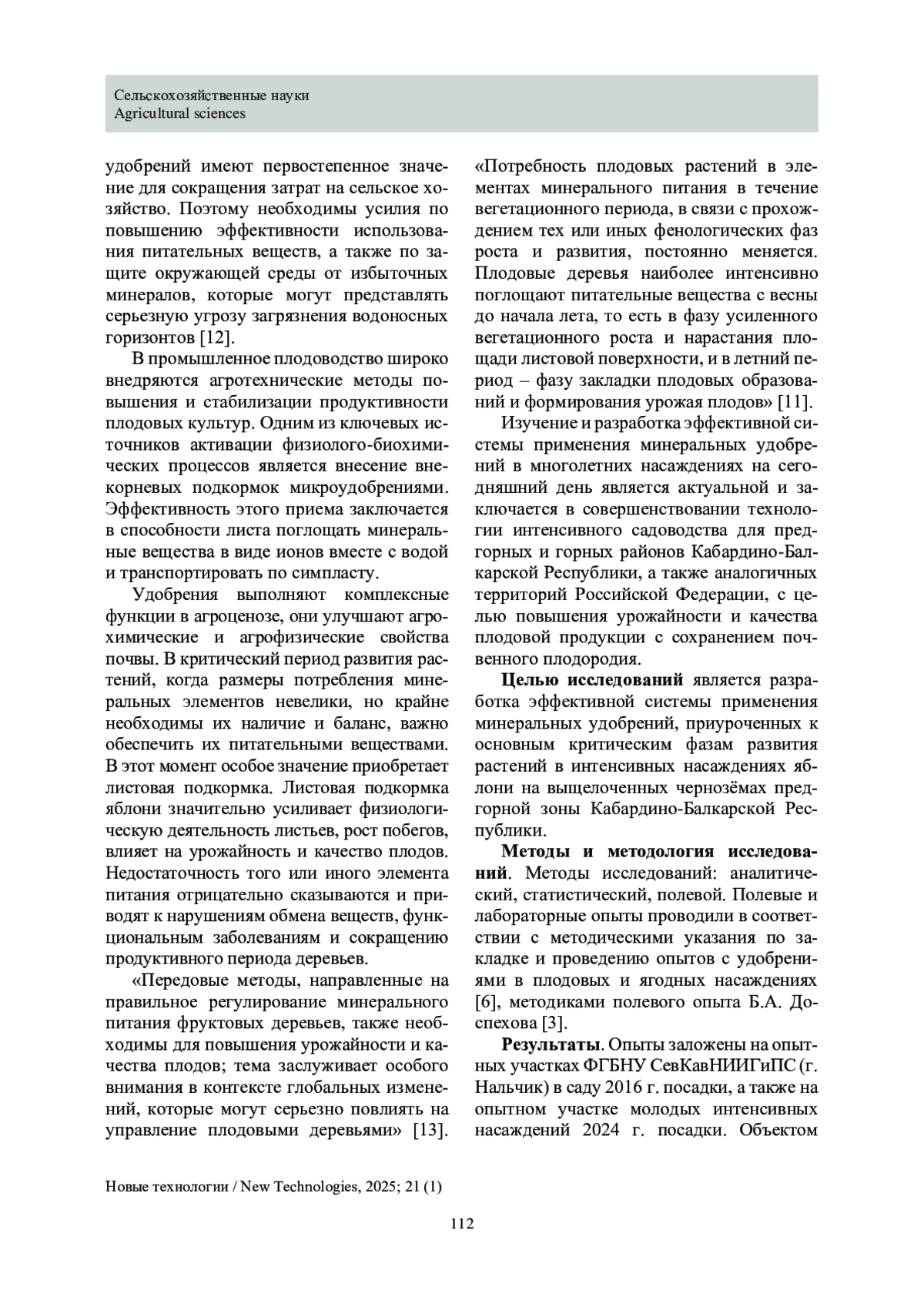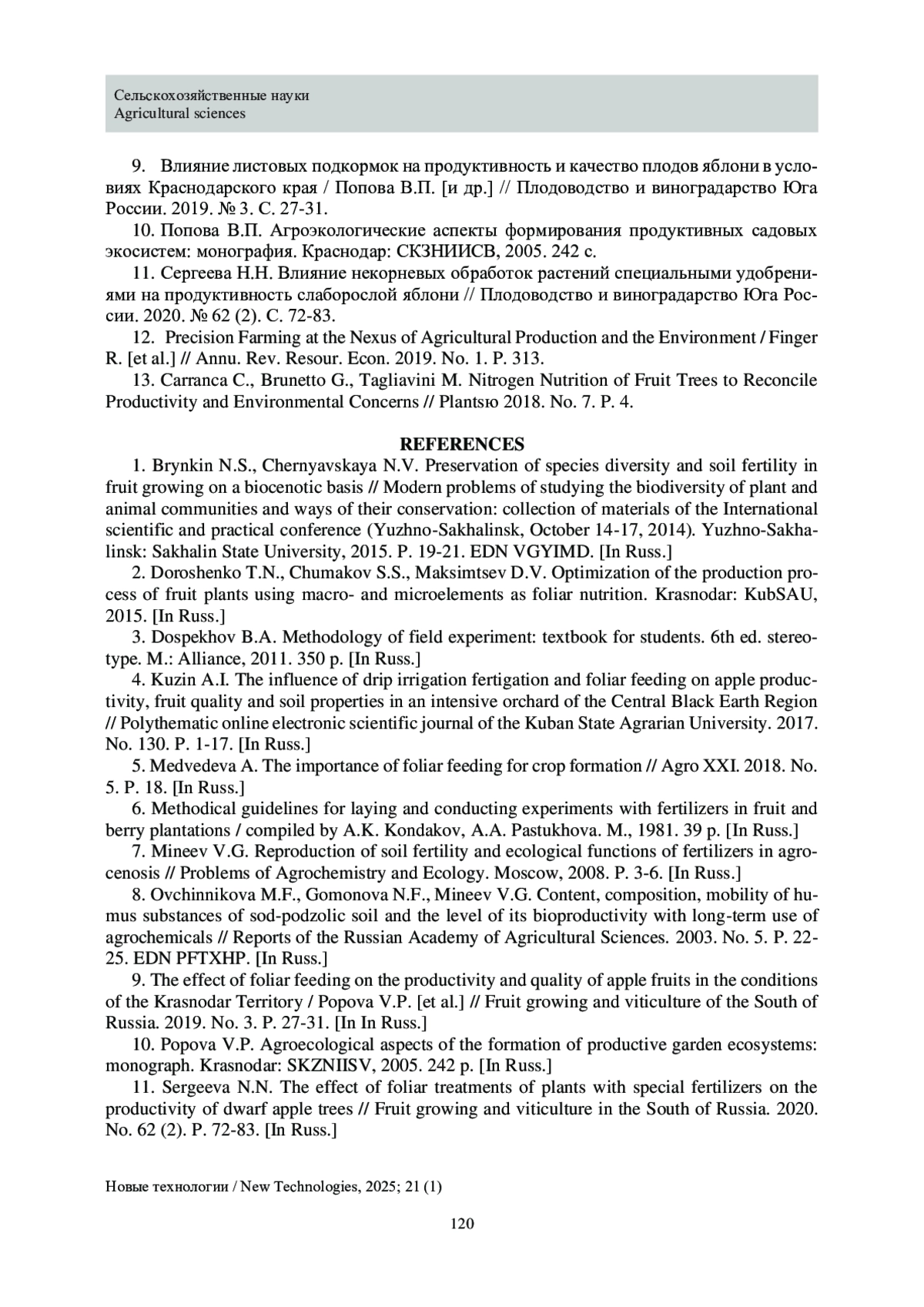 11. Sergeeva N.N. Vliyanie nekornevykh obrabotok rastenii spetsial’nymi udobreniyami na produktivnost’ slaborosloi yabloni // Plodovodstvo i vinogradarstvo Yuga Rossii. 2020. № 62 (2). S. 72-83.