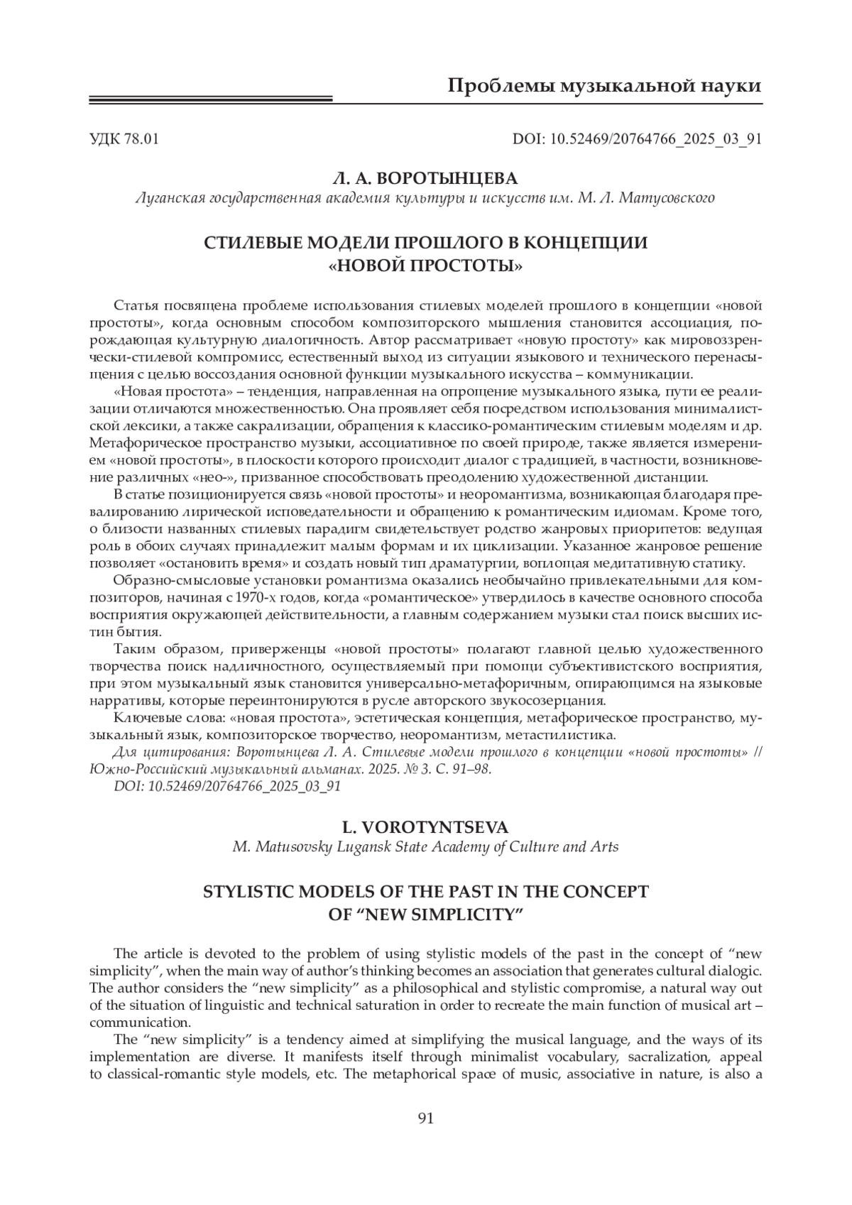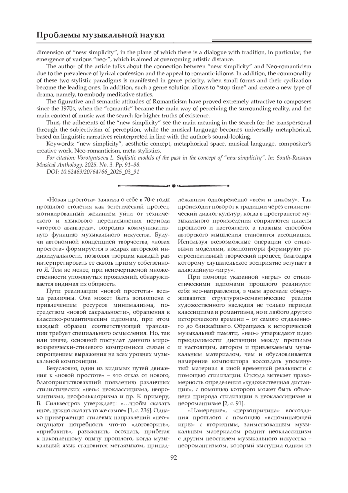 Статья посвящена проблеме использования стилевых моделей прошлого в концепции «новой простоты», когда основным способом композиторского мышления становится ассоциация, порождающая культурную диалогичность. Автор рассматривает «новую простоту» как мировоззренчески-стилевой компромисс, естественный выход из ситуации языкового и технического перенасыщения с целью воссоздания основной функции музыкального искусства - коммуникации. «Новая простота» - тенденция, направленная на опрощение музыкального языка, пути ее реализации отличаются множественностью. Она проявляет себя посредством использования минималистской лексики, а также сакрализации, обращения к классико-романтическим стилевым моделям и др. Метафорическое пространство музыки, ассоциативное по своей природе, также является измерением «новой простоты», в плоскости которого происходит диалог с традицией, в частности, возникновение различных «нео-», призванное способствовать преодолению художественной дистанции. В статье позиционируется связь «новой простоты» и неоромантизма, возникающая благодаря превалированию лирической исповедательности и обращению к романтическим идиомам. Кроме того, о близости названных стилевых парадигм свидетельствует родство жанровых приоритетов: ведущая роль в обоих случаях принадлежит малым формам и их циклизации. Указанное жанровое решение позволяет «остановить время» и создать новый тип драматургии, воплощая медитативную статику. Образно-смысловые установки романтизма оказались необычайно привлекательными для композиторов, начиная с 1970-х годов, когда «романтическое» утвердилось в качестве основного способа восприятия окружающей действительности, а главным содержанием музыки стал поиск высших истин бытия. Таким образом, приверженцы «новой простоты» полагают главной целью художественного творчества поиск надличностного, осуществляемый при помощи субъективистского восприятия, при этом музыкальный язык становится универсально-метафоричным, опирающимся на языковые нарративы, которые переинтонируются в русле авторского звукосозерцания.