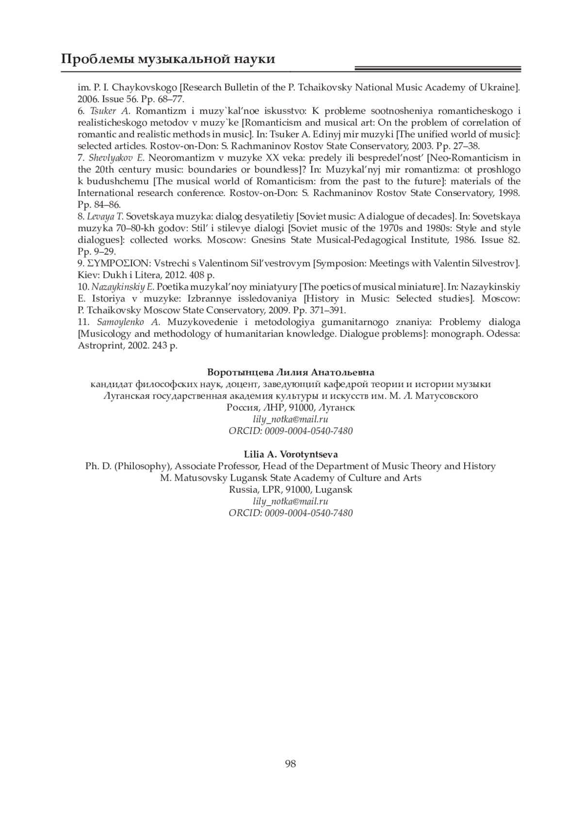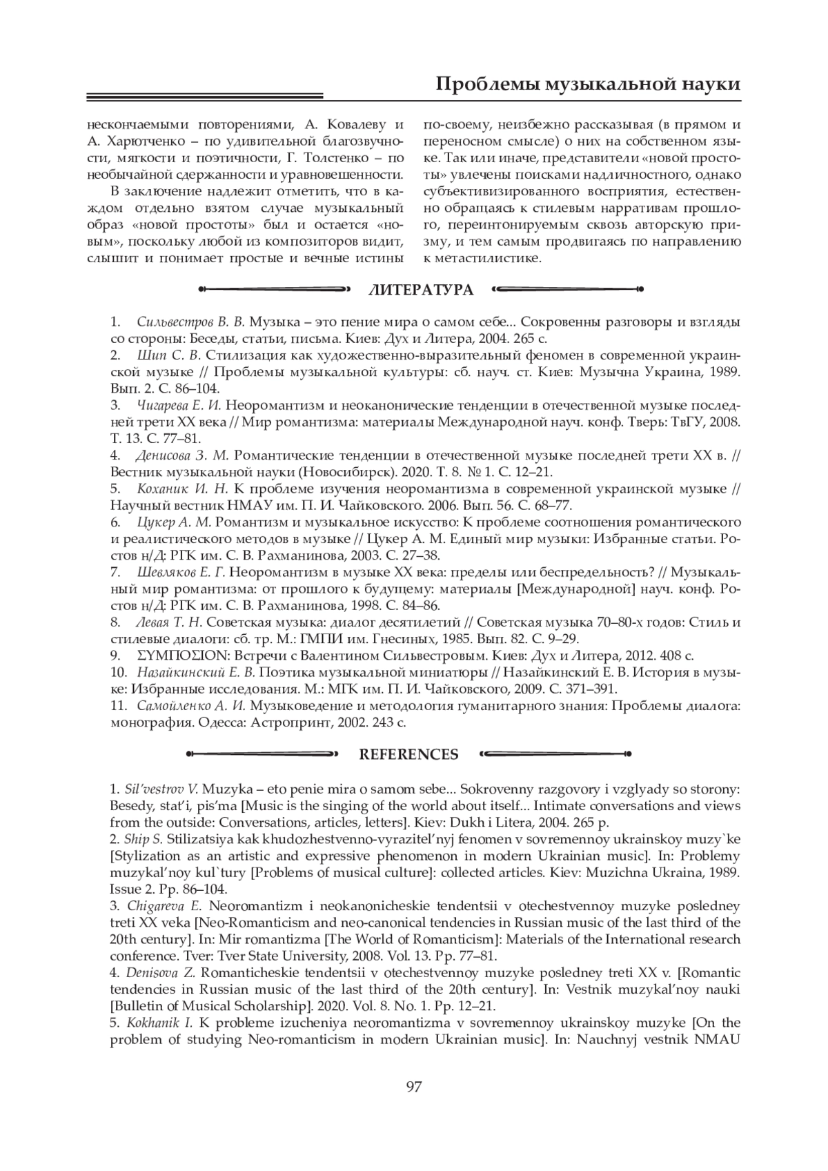 5. Коханик И. Н. К проблеме изучения неоромантизма в современной украинской музыке // Научный вестник НМАУ им. П. И. Чайковского. 2006. Вып. 56. С. 68-77.