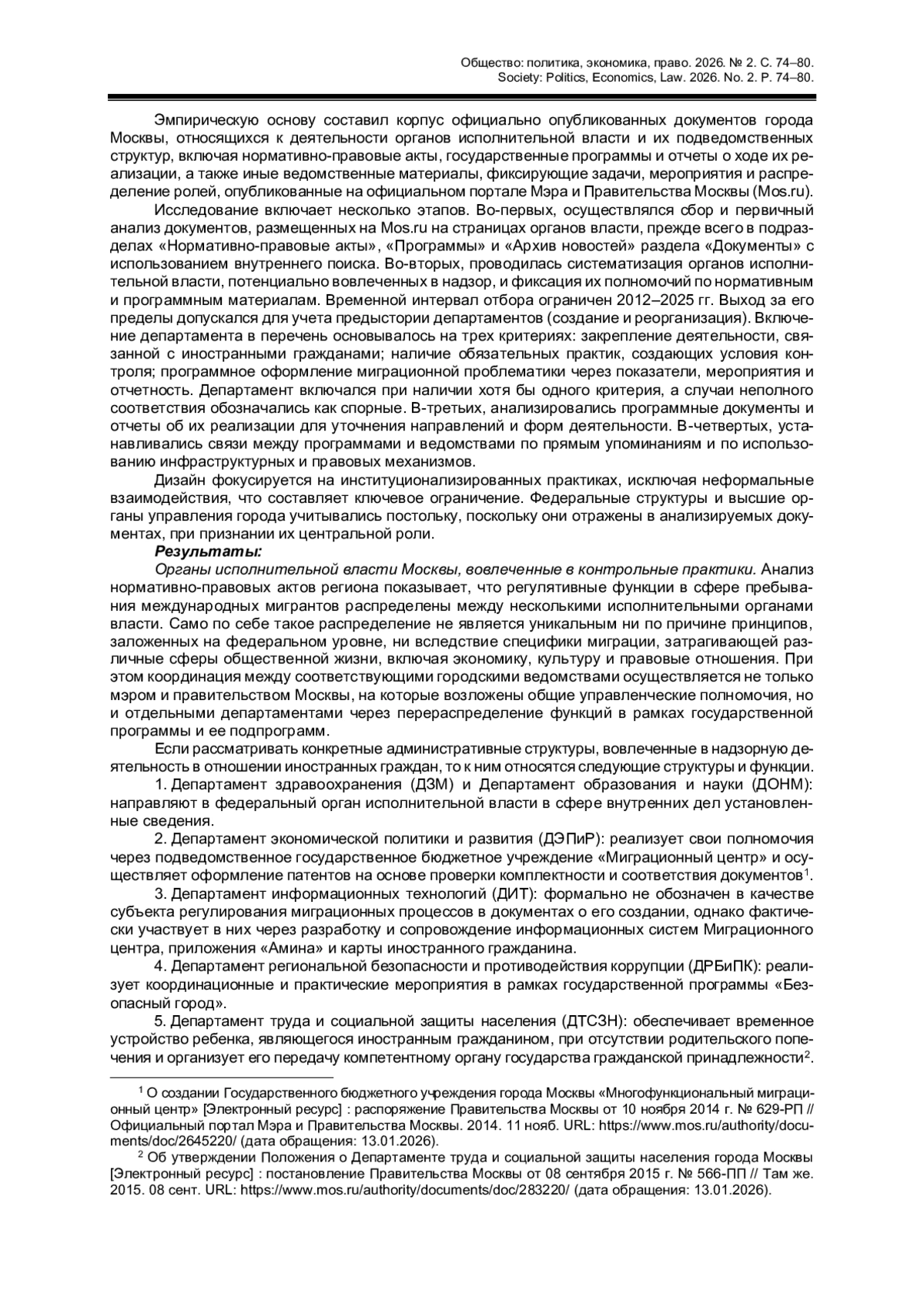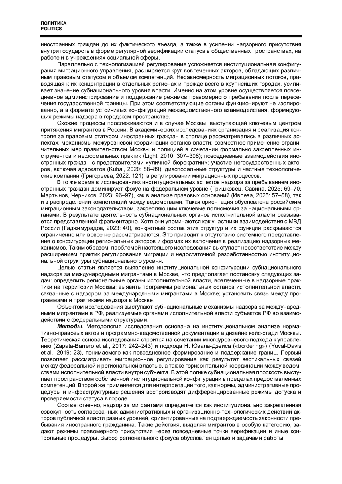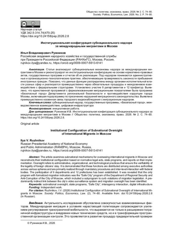 Статья анализирует субнациональные механизмы надзора за международными мигрантами в Москве и реконструирует их институциональную конфигурацию на основе нормативно-правовых актов, государственных программ и отчетов об их реализации. Под надзором понимаются административные и организационно-технологические практики, обеспечивающие проверяемость законности пребывания иностранных граждан. Показано, что данные функции распределены между органами исполнительной власти разных сфер и реализуются преимущественно через обязательные процедуры и межуровневое взаимодействие с федеральными структурами. Установлено участие 9 департаментов и 12 префектур. Выявлено, что единственной программой с формализованными миграционными показателями была программа «Безопасный город» Департамента региональной безопасности и противодействия коррупции города Москвы, включавшая подпрограмму по пресечению нарушений миграционного законодательства. Выявлена преимущественно косвенная связь городского видеонаблюдения с миграционным надзором.