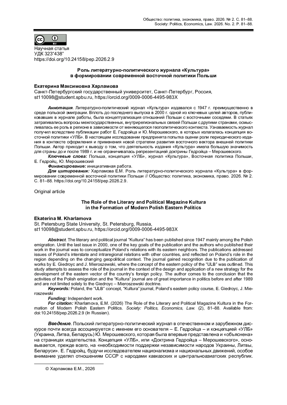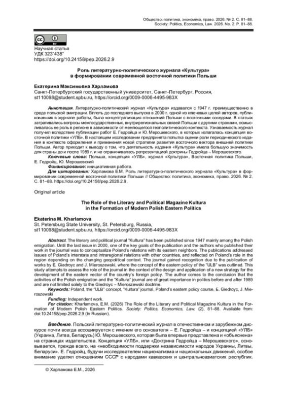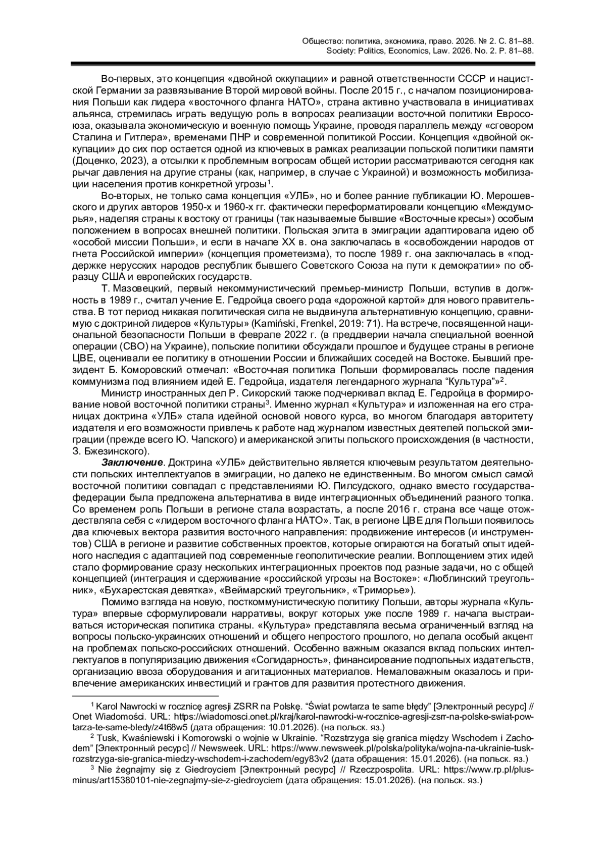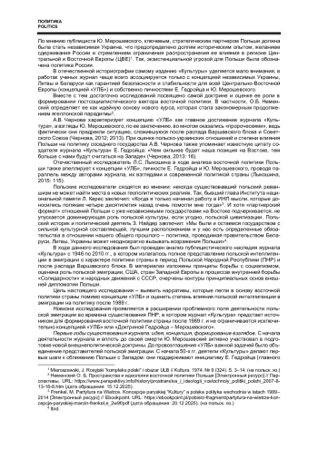 5. Kamiński T., Frenkel M. Aktualność tzw. “doktryny Giedroycia” w kontekście polityki Unii Europejskiej wobec Rosji // Przegląd Europejski. 2019. № 2. S. 69-83. (на польск. яз.). DOI: 10.5604/01.3001.0013.5821