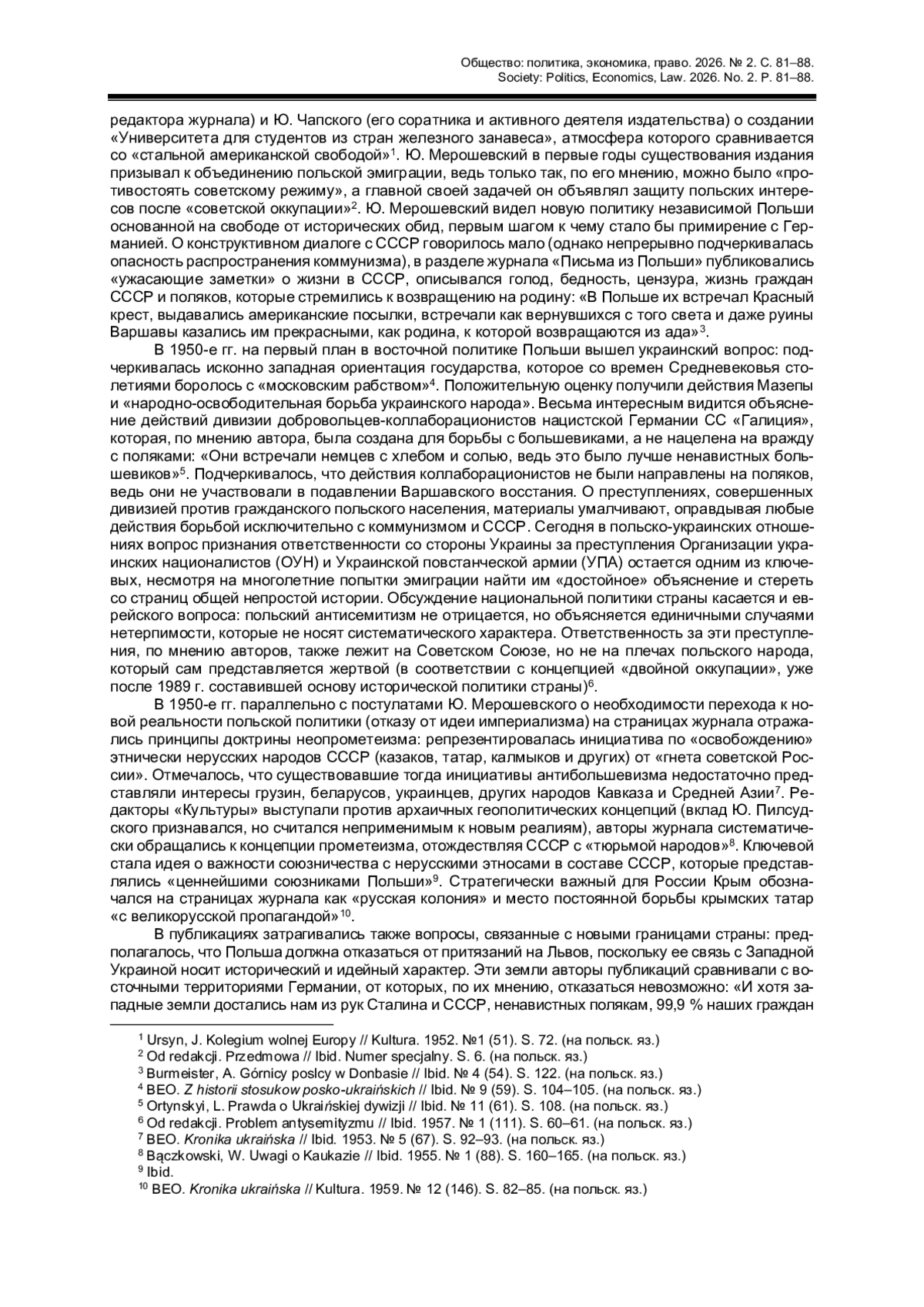 Автор приходит к выводу о том, что деятельность издания «Культура» имела большую значимость для страны до и после 1989 г. и не ограничивалась репрезентацией доктрины Гедройца - Мерошевского.