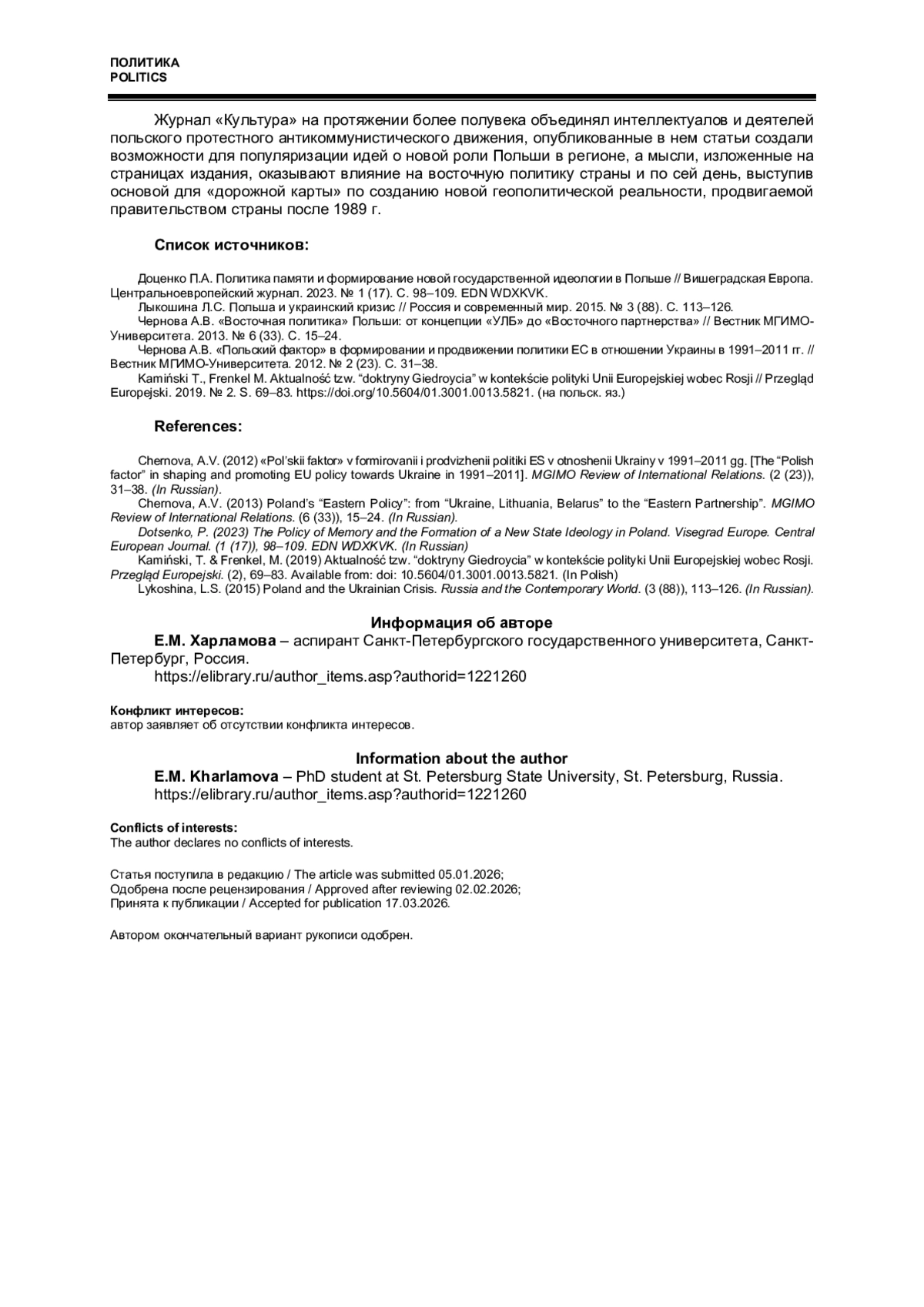 2. Лыкошина Л.С. Польша и украинский кризис // Россия и современный мир. 2015. № 3 (88). C. 113-126. EDN: UXLCLH
