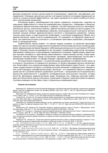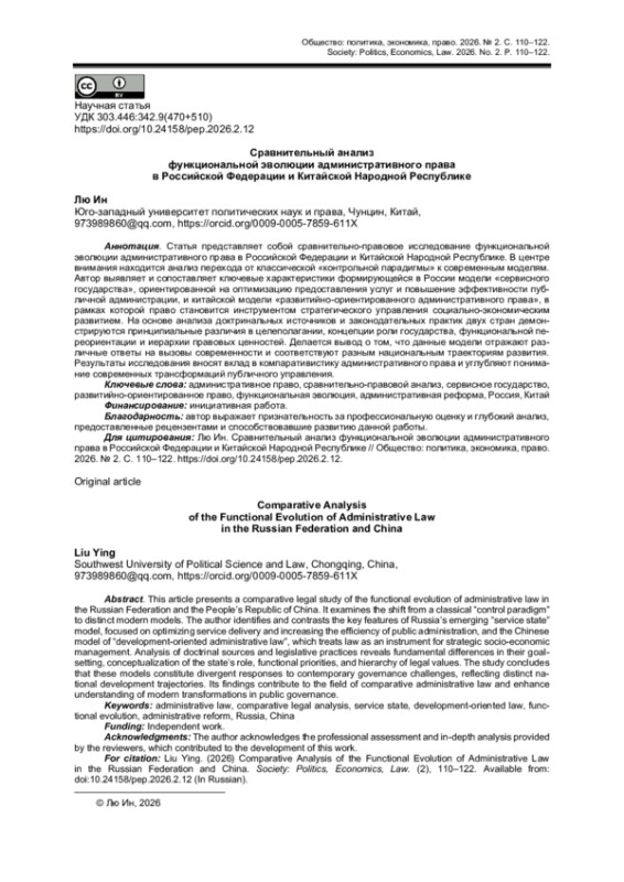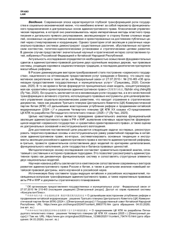 Статья представляет собой сравнительно-правовое исследование функциональной эволюции административного права в Российской Федерации и Китайской Народной Республике. В центре внимания находится анализ перехода от классической «контрольной парадигмы» к современным моделям. Автор выявляет и сопоставляет ключевые характеристики формирующейся в России модели «сервисного государства», ориентированной на оптимизацию предоставления услуг и повышение эффективности публичной администрации, и китайской модели «развитийно-ориентированного административного права», в рамках которой право становится инструментом стратегического управления социально-экономическим развитием. На основе анализа доктринальных источников и законодательных практик двух стран демонстрируются принципиальные различия в целеполагании, концепции роли государства, функциональной переориентации и иерархии правовых ценностей.