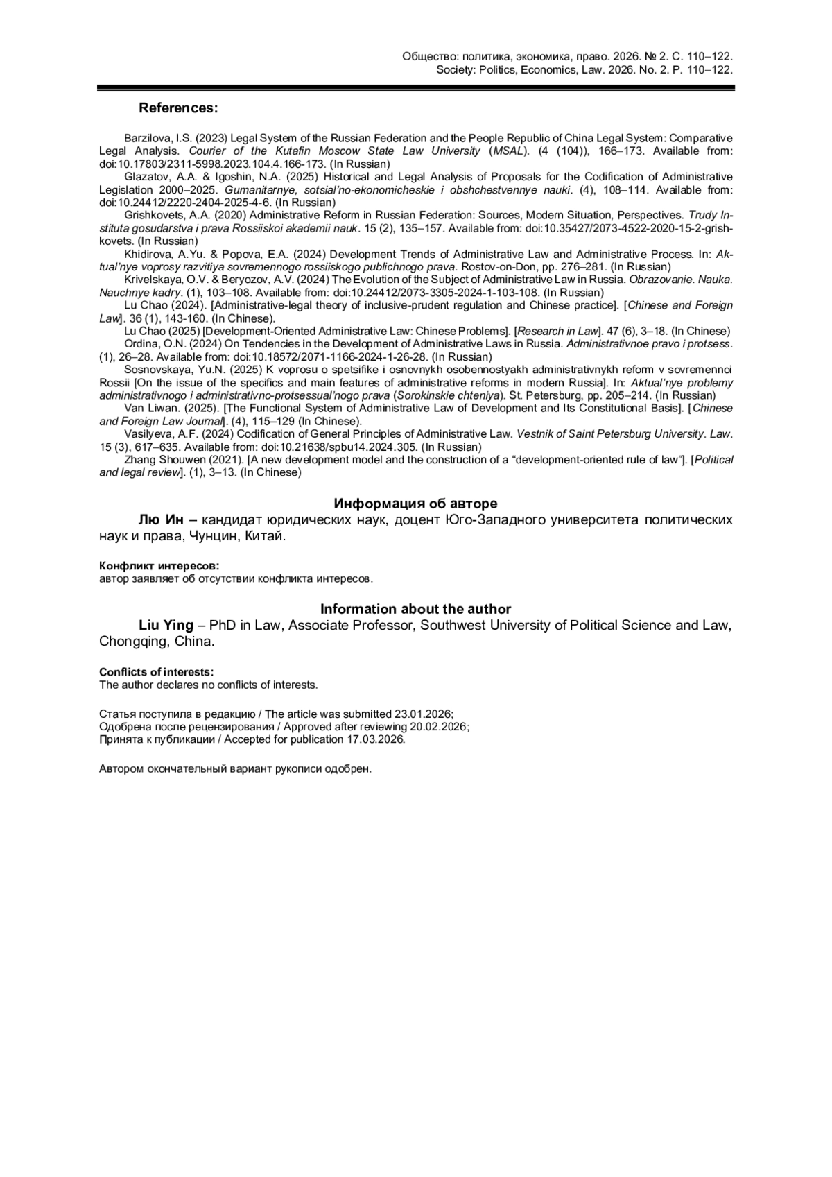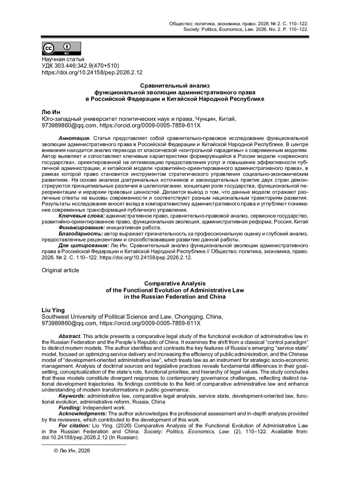 10. 王理万。发展型行政法的功能体系及其宪法基础 // 行政法学研究. 2025. 4期。 第115-129页. Ван Ливань. Функциональная система административного права развития и ее конституционная основа // Исследования административного права. 2025. № 4. С. 115-129 (на кит. яз.).