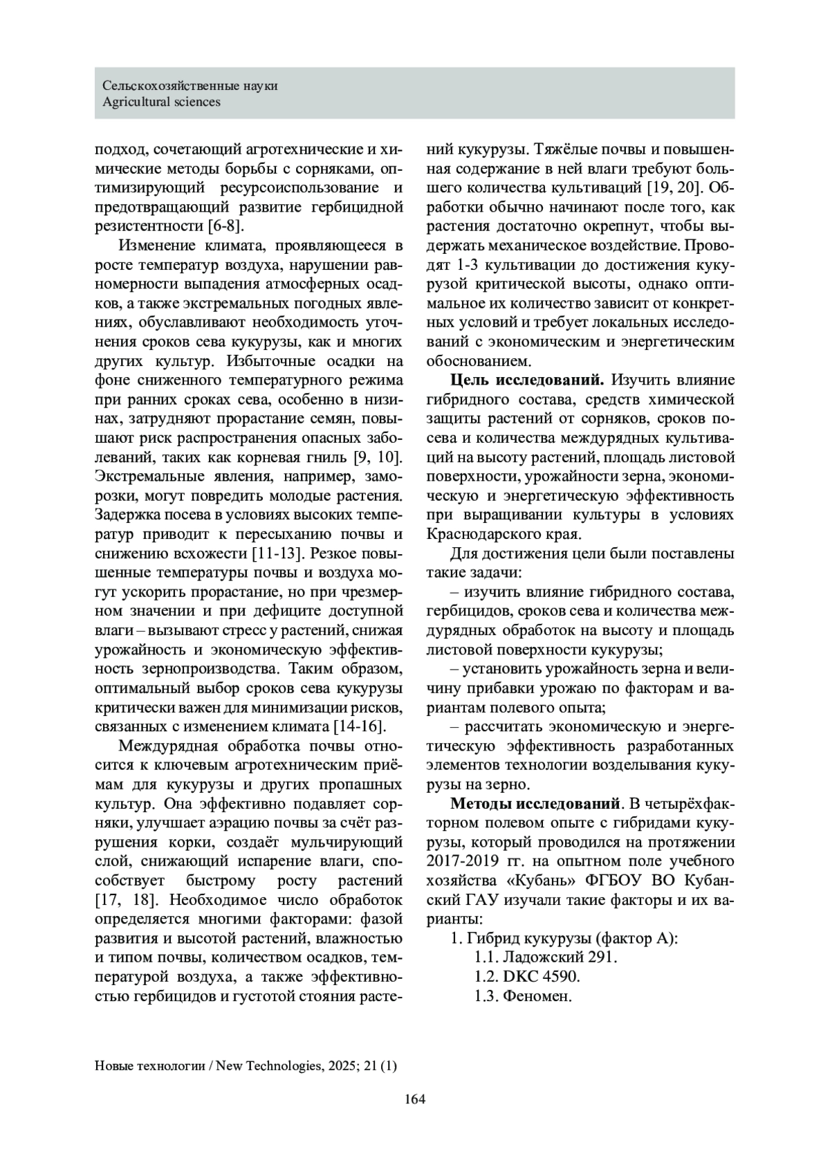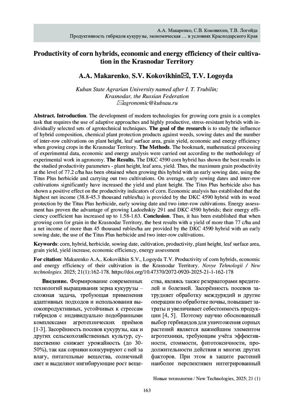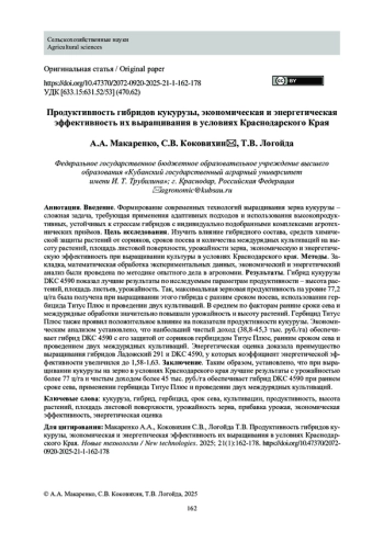 Введение. Формирование современных технологий выращивания зерна кукурузы – сложная задача, требующая применения адаптивных подходов и использования высокопродуктивных, устойчивых к стрессам гибридов с индивидуально подобранными комплексами агротехнических приёмов.