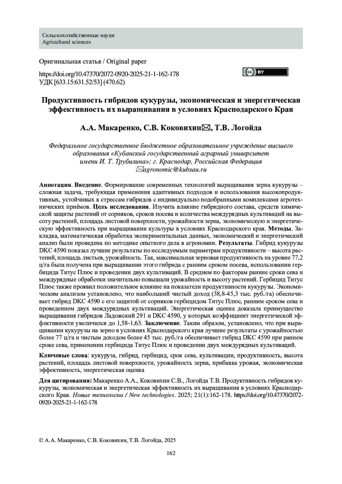 10. Effektivnost’ primeneniya intensivnoi i biologizirovannoi tekhnologii vyrashchivaniya gibridov kukuruzy pri kapel’nom oroshenii / O. V. Makukha [i dr.] // Izvestiya sel’skokhozyaistvennoi nauki Tavridy. 2024. № 38(201). S. 101-116.