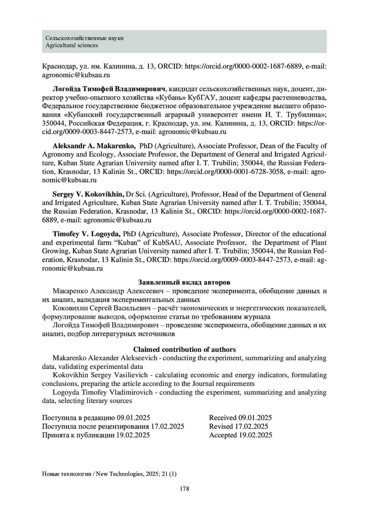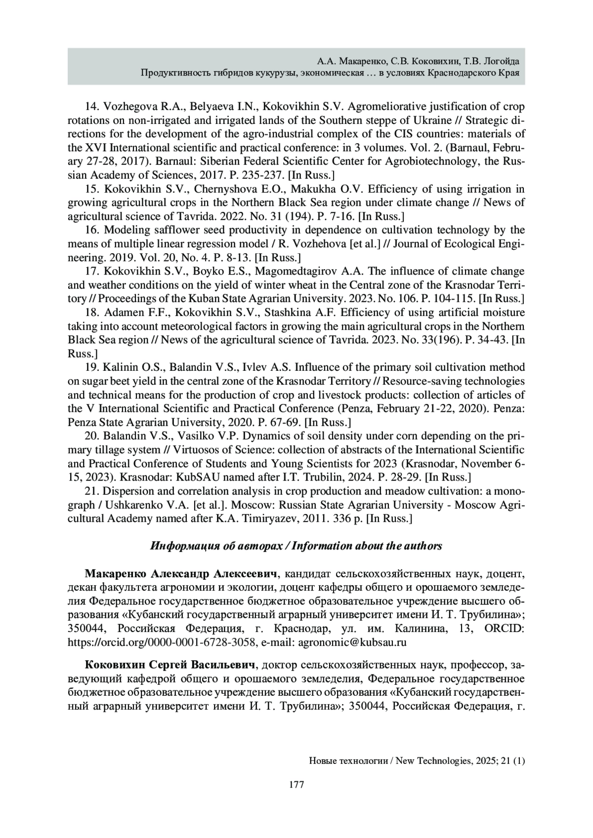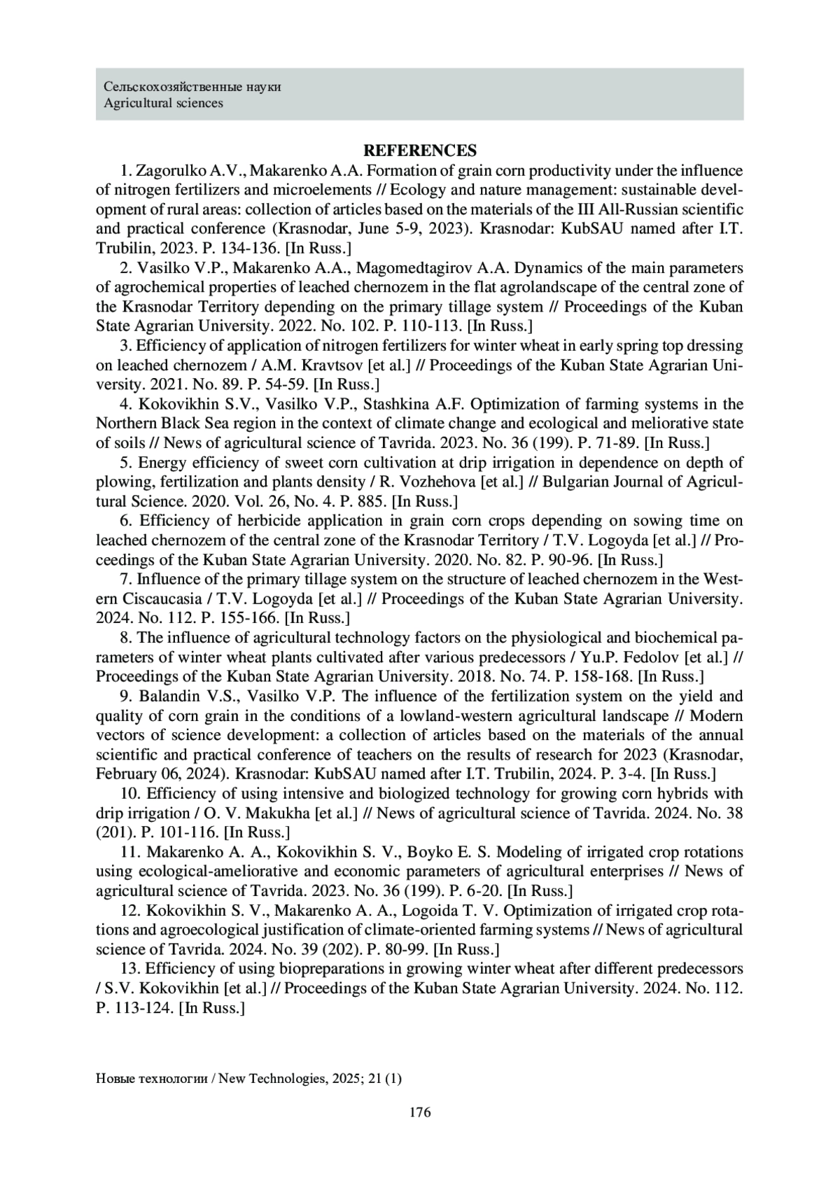 12. Kokovikhin S.V., Makarenko A.A., Logoida T.V. Optimizatsiya oroshaemykh sevooborotov i agroekologicheskoe obosnovanie klimaticheski orientirovannykh sistem zemledeliya // Izvestiya sel’skokhozyaistvennoi nauki Tavridy. 2024. № 39(202). S. 80-99.