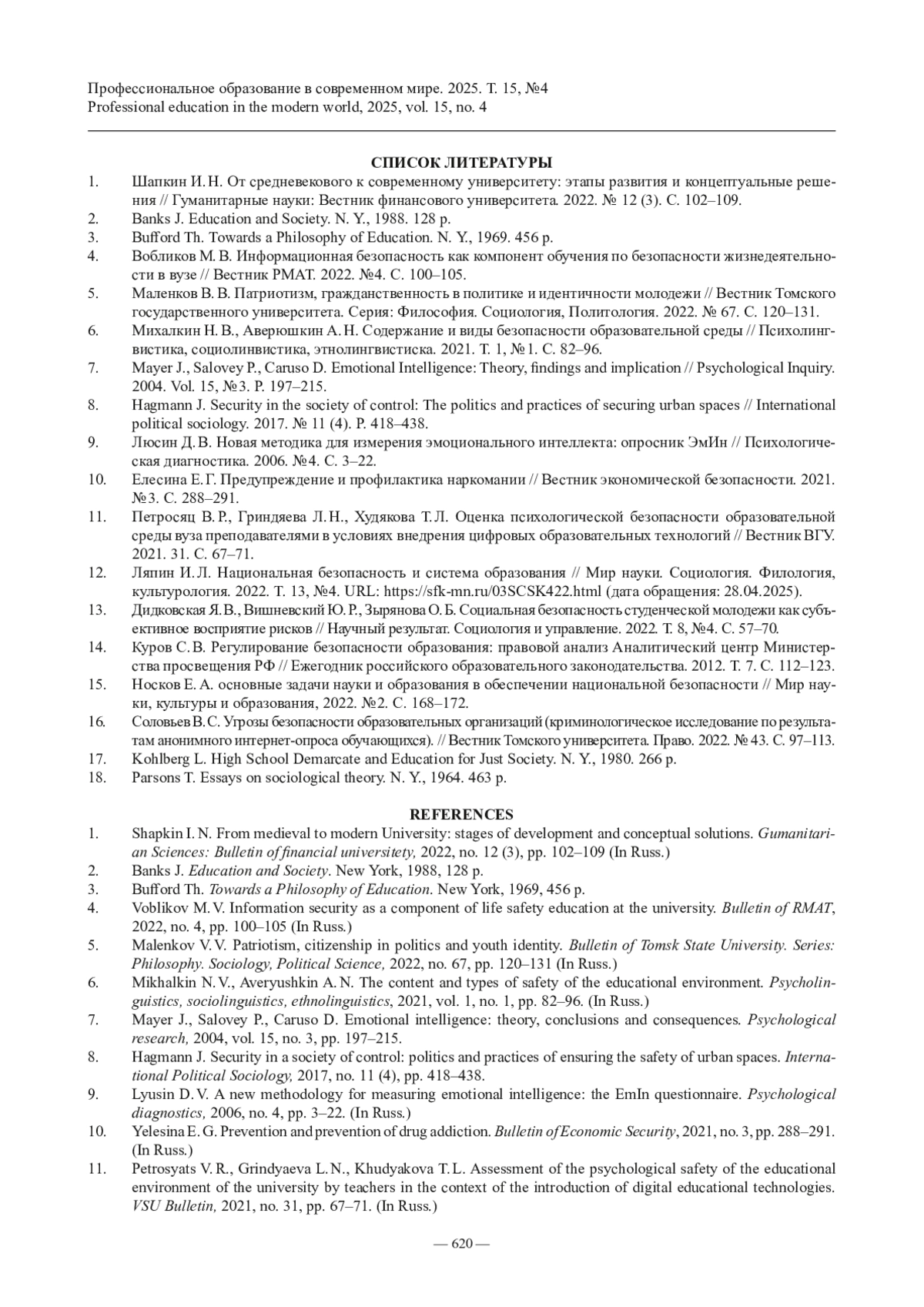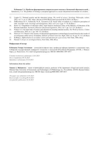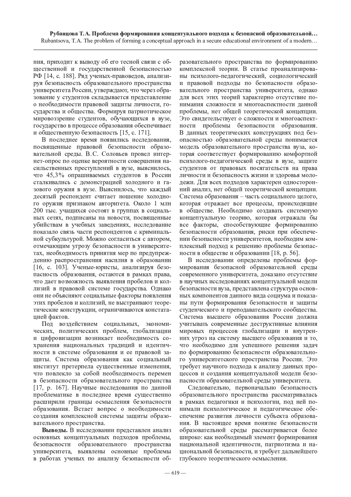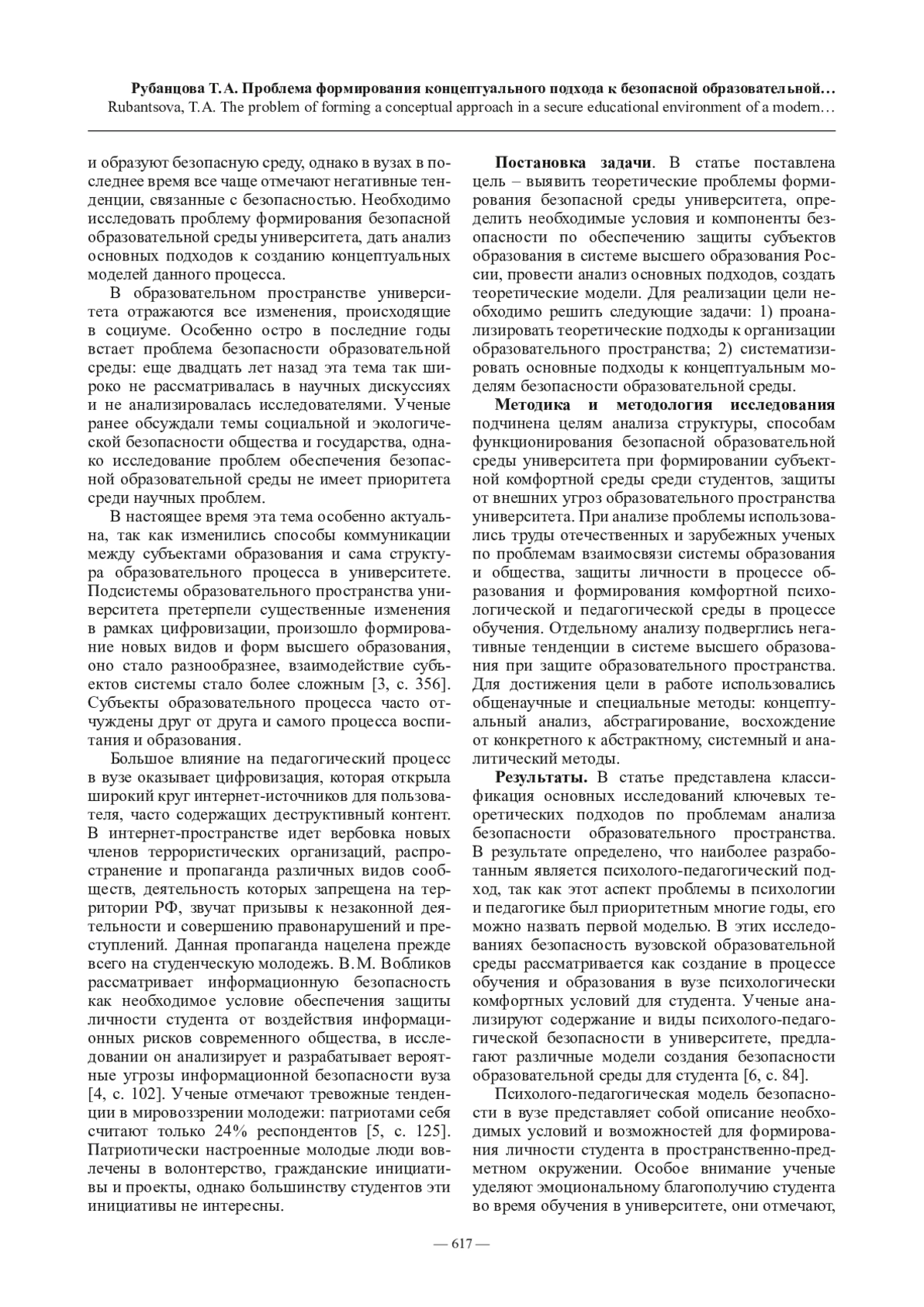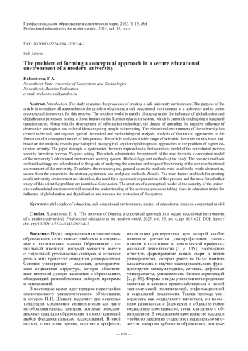 Введение. В исследовании рассматриваются процессы формирования безопасной окружающей среды университета. Цель статьи состоит в анализе всех подходов к проблеме формирования безопасной образовательной среды вуза и создании концептуальной основы данного процесса. Современный мир под воздействием процессов глобализации, цифровизации стремительно меняется, оказывая прямое воздействие на систему образования России, которая в настоящее время проходит структурную трансформацию. Вместе с развитием информационных технологий возрастает опасность распространения негативного влияния деструктивных идеологических и культурных идей на молодежь. Образовательная среда университета перестала быть безопасной и требует особого теоретического и методологического анализа, анализа теоретических подходов к формированию концептуальной модели данного процесса. В статье дан анализ широкого спектра научной литературы по выбранной проблематике и на основании анализа раскрыты психологический, педагогический, правовой и философский подходы к проблеме безопасности высшего образования. В работе предпринята попытка систематизации основных подходов к теоретической модели процесса формирования безопасности образовательного процесса. Постановка задачи. В статье обосновывается необходимость создания концептуальной модели системы безопасности образовательной среды университета. Методика и методология исследования подчинена целям анализа структуры, способам функционирования безопасной образовательной среды университета. Для достижения цели исследования в работе использовались общенаучные методы: абстрагирования, восхождения от конкретного к абстрактному, системный и аналитический методы. Результаты. Определены основные факторы и инструменты создания безопасной среды вуза, выявлена необходимость системной организации данного процесса и необходимость дальнего исследования данной научной проблемы. Выводы. Создание концептуальной модели безопасности образовательной среды вуза позволит расширить понимание системных процессов, происходящих в образовании под воздействие глобализации и цифровизации и увеличить защиту системы.