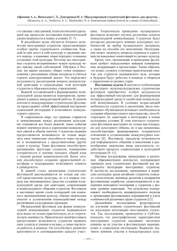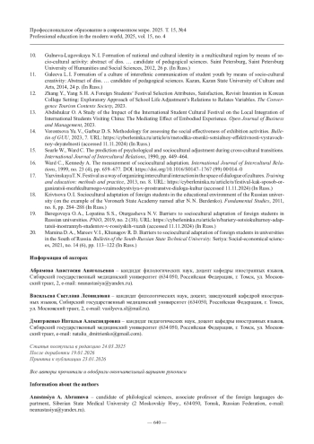 8. Евтюгина А. А. Социокультурная значимость фестиваля в межкультурной коммуникации и социализации иностранных студентов в вузе // Cross-Cultural Studies: Education and Science. 2018. № 3. С. 453-458.