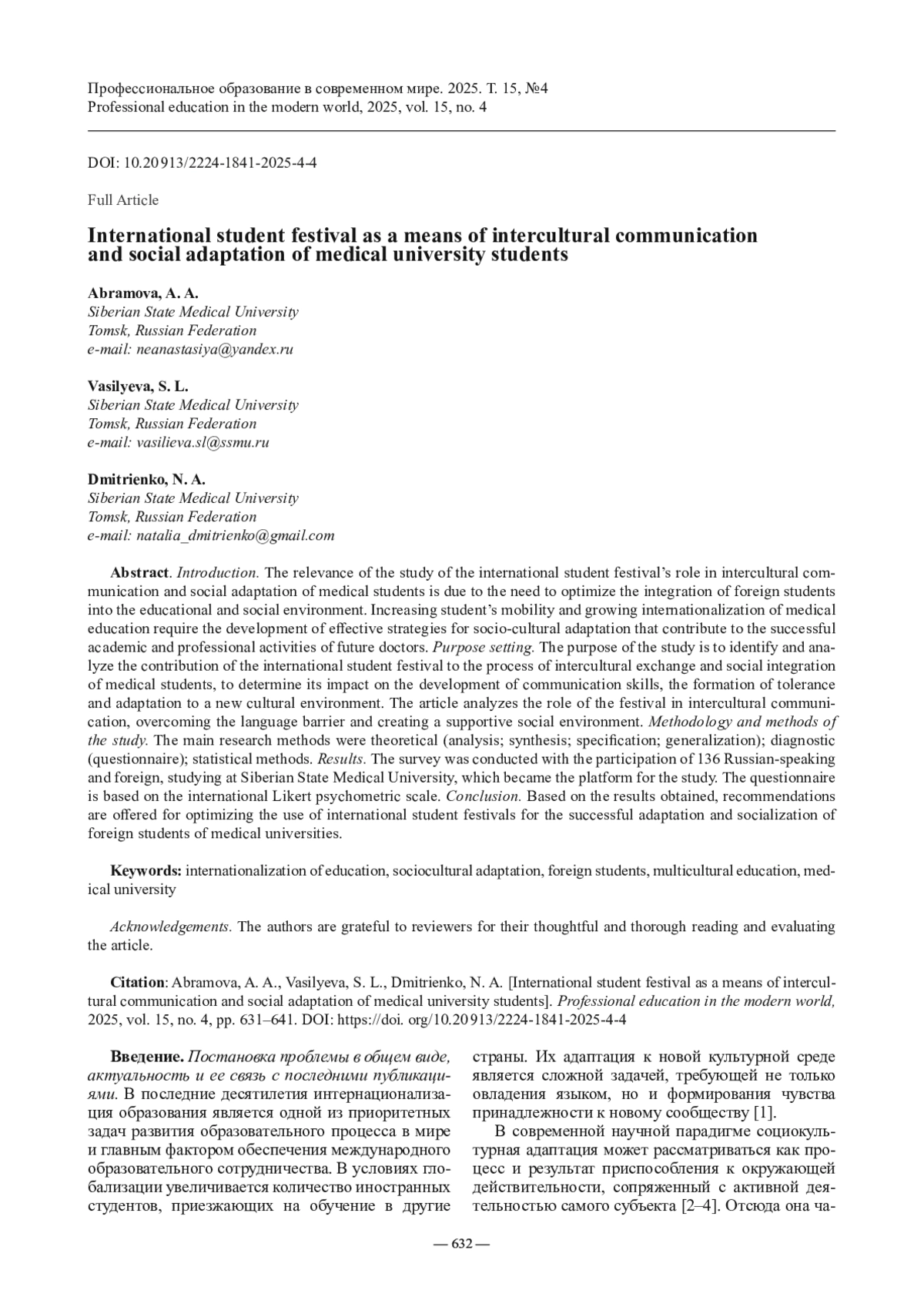 Введение. Актуальность исследования роли международного студенческого фестиваля в межкультурной коммуникации и социальной адаптации студентов медицинского вуза обусловлена необходимостью оптимизации интеграции иностранных студентов в образовательную и социальную среду. Повышение мобильности студентов и растущая интернационализация медицинского образования требуют разработки эффективных стратегий социокультурной адаптации, способствующих успешной академической и профессиональной деятельности будущих медиков. Постановка задачи. Цель исследования – выявить и проанализировать вклад международного студенческого фестиваля в процесс межкультурного обмена и социальной интеграции студентов медицинского вуза, определить его влияние на развитие коммуникативных навыков, формирование толерантности и адаптацию к новой культурной среде. В статье анализируется роль фестиваля в межкультурной коммуникации, преодолении языкового барьера и создании поддерживающей социальной среды. Методика и методология исследования. Основными методами исследования стали теоретические (анализ, синтез, конкретизация, обобщение), диагностические (анкетирование), статистические методы. Результаты. Анкетирование проводилось с участием 136 студентов из России, ближнего и дальнего зарубежья, обучающихся в Сибирском государственном медицинском университете, который стал площадкой для проведения исследования. В основе анкеты лежит международная психометрическая шкала Лайкерта. Выводы. На основе полученных результатов предлагаются рекомендации по оптимизации использования международных студенческих фестивалей для успешной адаптации и социализации иностранных студентов медицинских вузов.