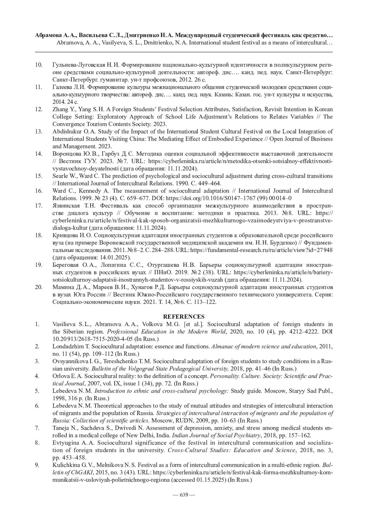 1. Васильева С. Л., Абрамова А. А., Волкова М. Г. [и др.] Социокультурная адаптация иностранных студентов в Сибирском регионе // Профессиональное образование в современном мире. 2020. Т. 10, № 4. С. 4212- 4222. https://doi.org/10.20913/2618-7515-2020-4-05