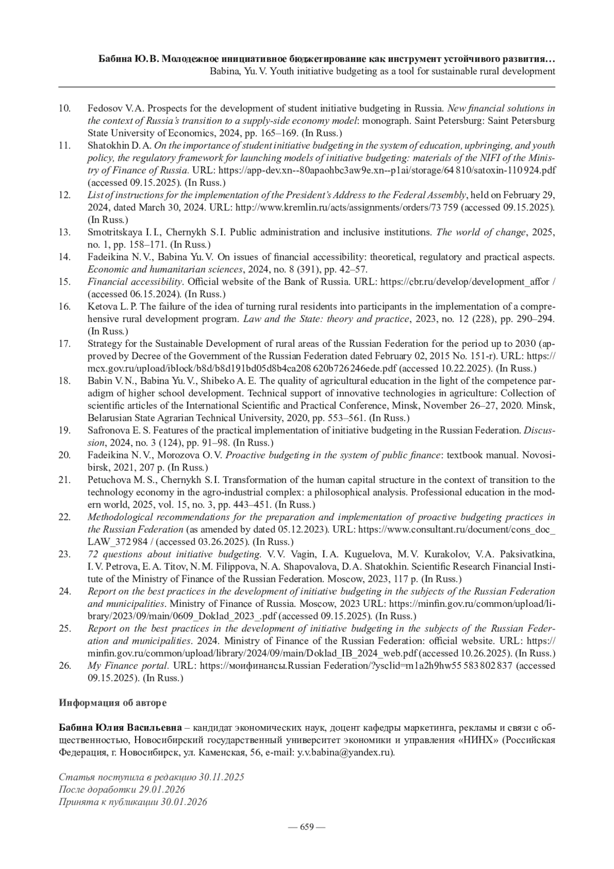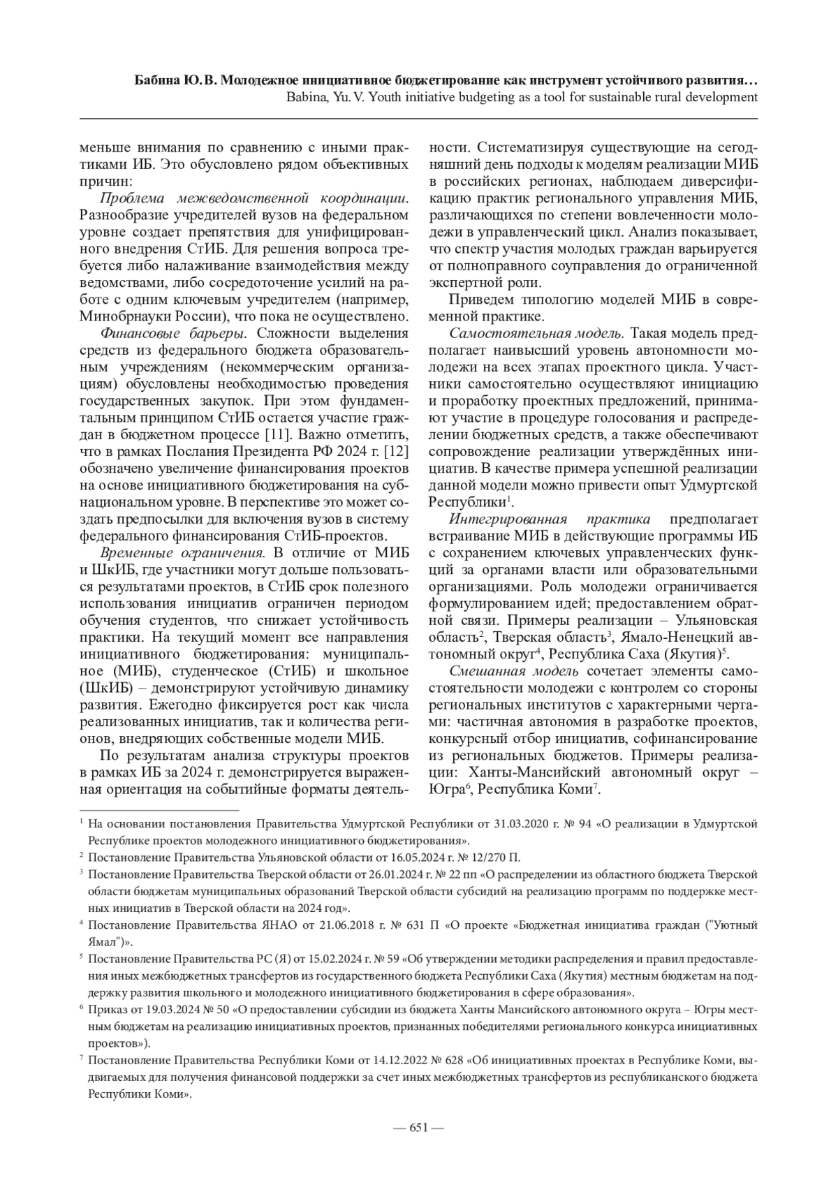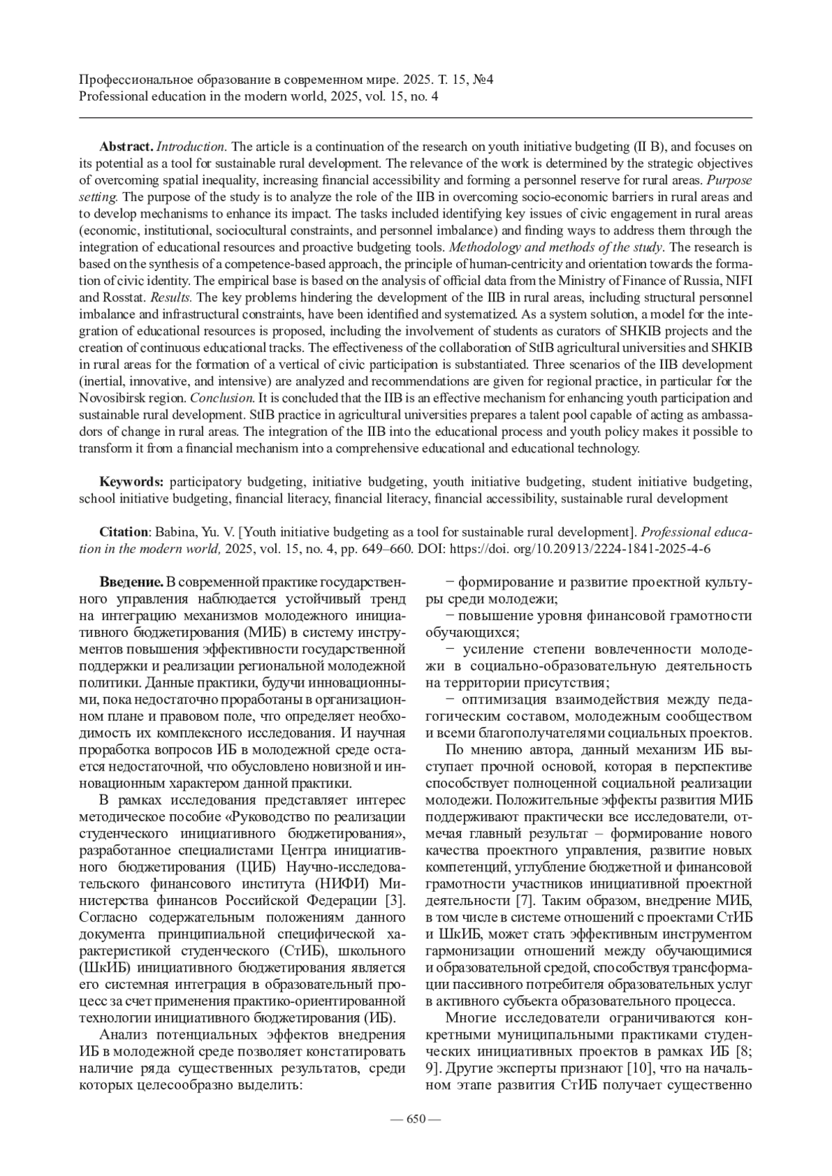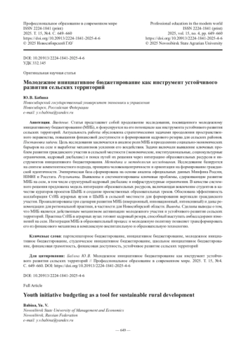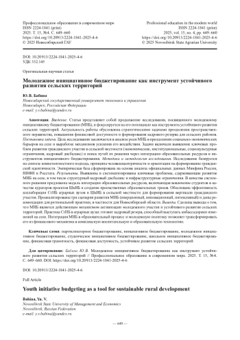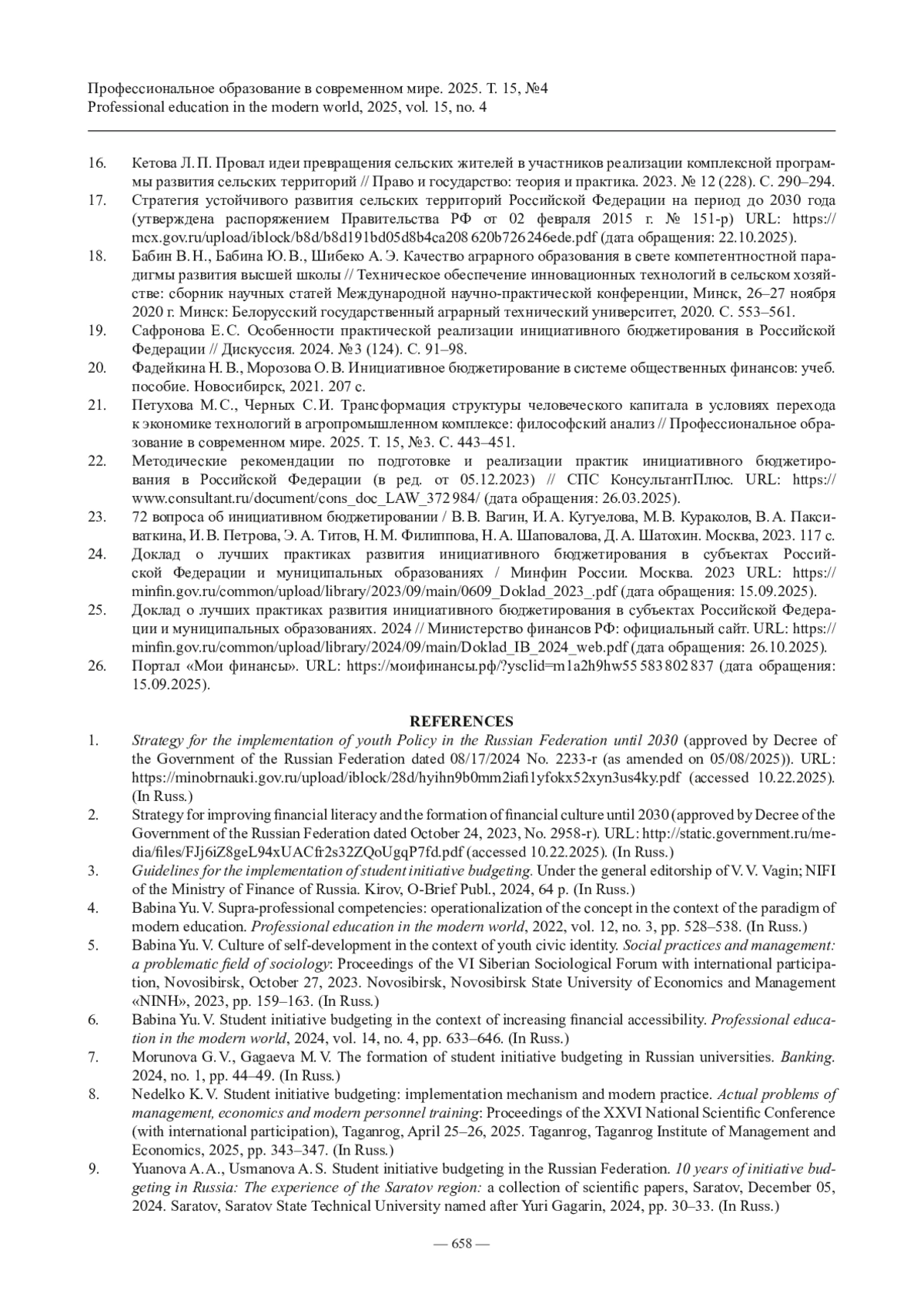 6. Бабина Ю. В. Студенческое инициативное бюджетирование в контексте повышения финансовой доступности // Профессиональное образование в современном мире. 2024. Т. 14, № 4. С. 633-646.