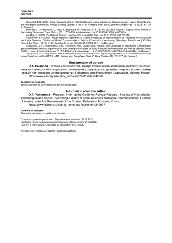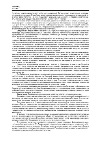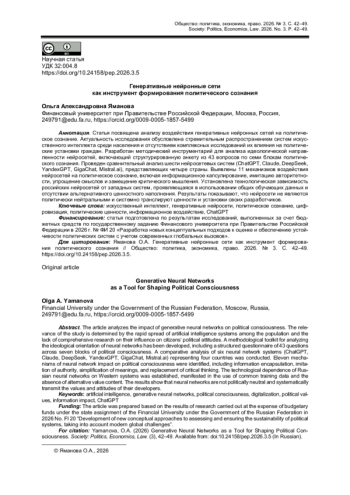 4. Зиновьева Е.С., Трапезников В.П. Международно-политическая предвзятость больших языковых моделей: критический дискурс-анализ нарративов ChatGPT, LLaMA, Gemini и DeepSeek // Полис. Политические исследования. 2026. № 1. С. 157-177. https://doi.org/10.17976/jpps/2026.01.11. EDN: VAVKWA.