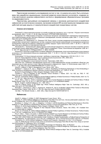 3. Володенков С.В., Федорченко С.Н., Печенкин Н.М. Риски, угрозы и вызовы внедрения искусственного интеллекта и нейросетевых алгоритмов в современную систему социально-политических коммуникаций: по материалам экспертного исследования // Вестник Российского университета дружбы народов. Серия: Политология. 2024. Т. 26, № 2. С. 406-410. https://doi.org/10.22363/2313-1438-2024-26-2-406-424.
