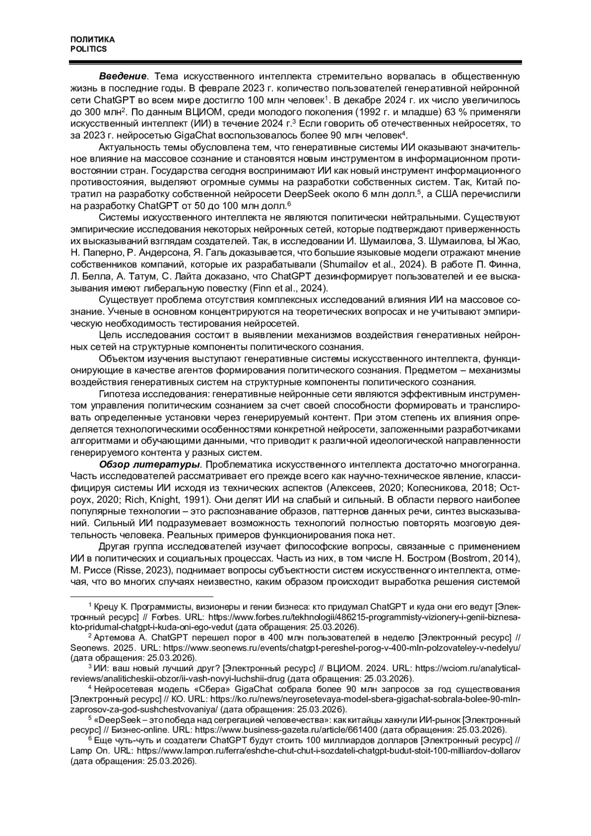 16. Finn P., Bell L., Tatum A., Leicht C. Assessing ChatGPT as a Tool for Research on US State and Territory Politics // Political Studies Review. 2024. Vol. 23, iss. 3. P. 906-915. https://doi.org/10.1177/14789299241268652.