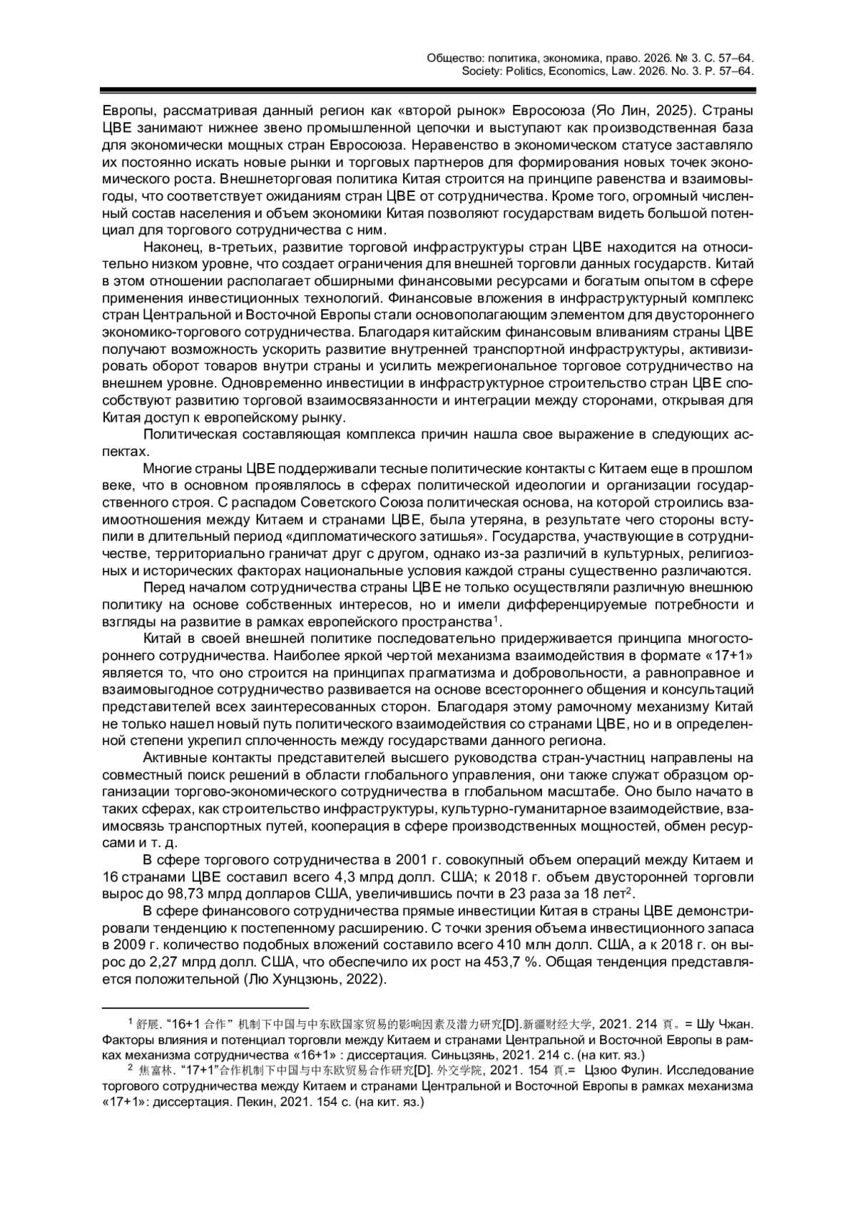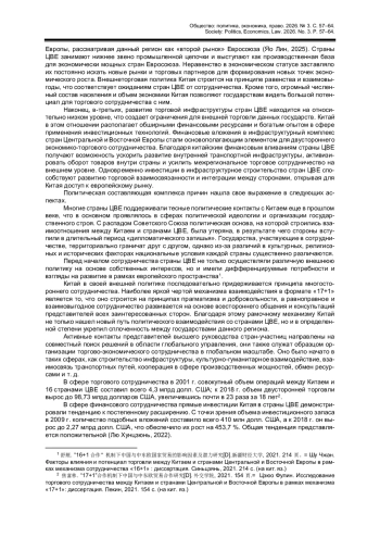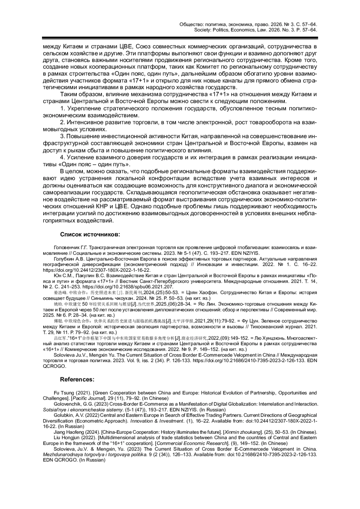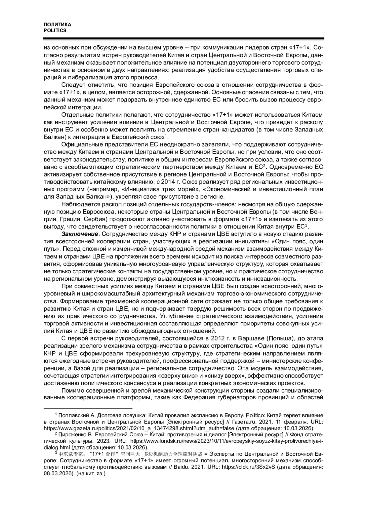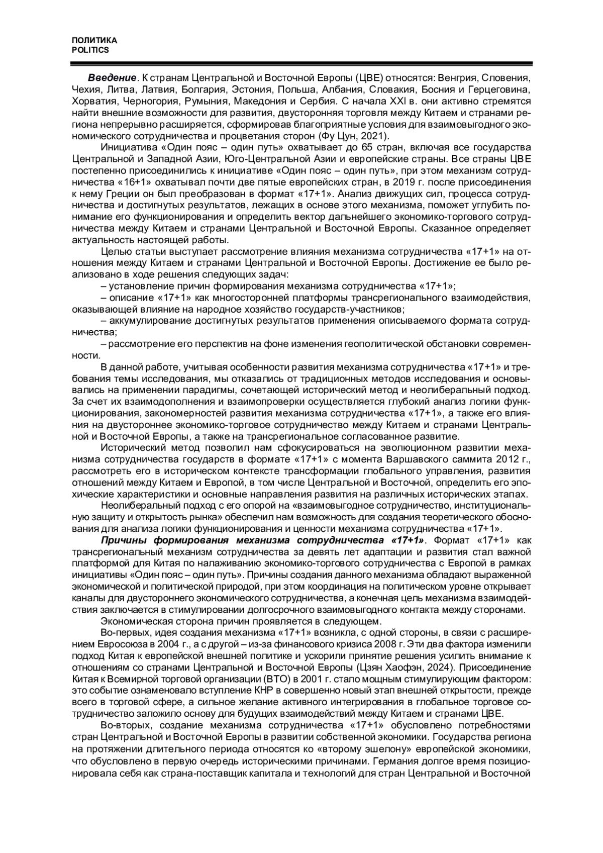 Формат международного сотрудничества «16+1», созданный в 2012 г. для реализации всестороннего взаимодействия между Китаем и странами Центральной и Восточной Европы, был преобразован в механизм «17+1» после присоединения Греции. За девять лет развития он непрерывно совершенствовался, а сформировавшаяся платформа взаимодействия стала определяющим фактором для повышения уровня экономико-торгового сотрудничества между Китаем и странами Центральной и Восточной Европы. Автором отмечается, что этот процесс перешел на новый этап качественного развития благодаря совместным усилиям государств-участников инициативы «Один пояс и один путь». В сложной и меняющейся международной обстановке механизм сотрудничества между государствами неизменно основывается на поиске общих интересов в области совместного развития и формирует многоуровневую структуру управления. Она предполагает не только стратегические контакты на государственном уровне, но и практическое сотрудничество в регионах, демонстрируя выдающуюся инклюзивность и инновационность. В данной статье анализируется влияние механизма сотрудничества «17+1» на взаимодействие указанных стран. В работе использовались методы индукции и дедукции, наблюдения, обобщения и аналогии.