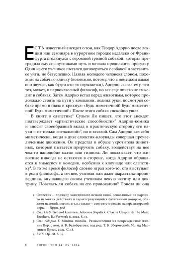 В книге о слэпстике1 Сульги Ли пишет, что этот анекдот подтверждает «артистические способности»2 Адорно-комика и вносит своеобразный вклад в практическую сторону его науки — не только «печальной»3, но и веселой. Сам Адорно вел себя миметически, когда в духе слэпстик-клоунады совершал преувеличенные движения. Он предстал в образе укротителя животных, который пытается приручить собаку, воздействуя на нее чем-то наподобие магии или гипноза. Ли показывает, что животные никогда не остаются в стороне, когда Адорно обращается к мимесису и комедии, особенно к клоунаде или слэпстику4. В то же время философ словно играл кого-то, кто выступает в роли философа, а точнее, учителя или даже шарлатана-проповедника, внушающего своим ученикам некую истину или доктрину.