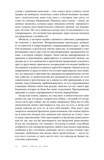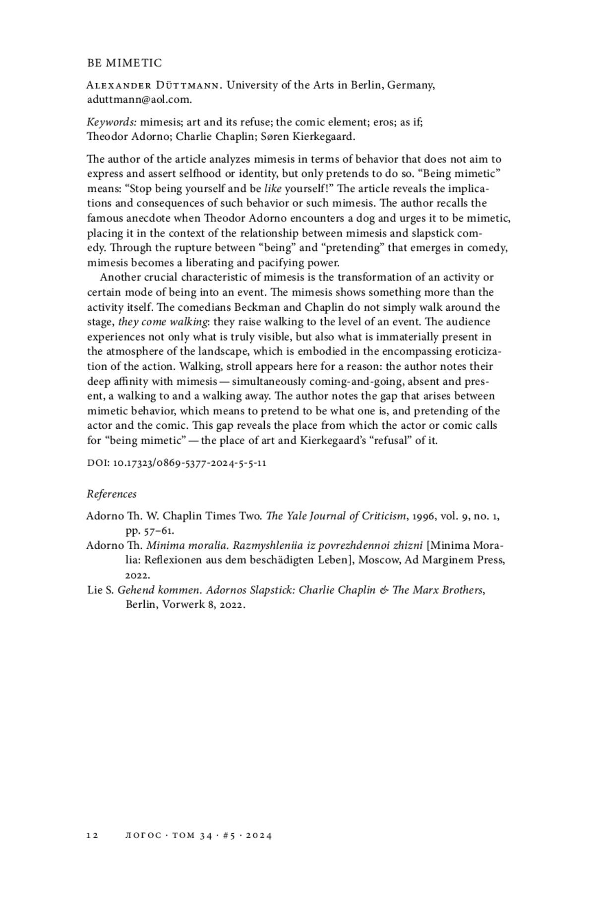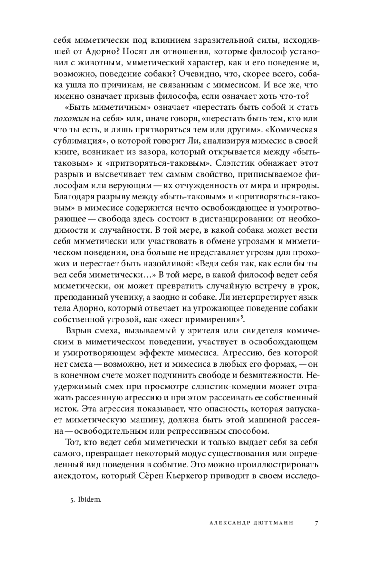 Автор статьи анализирует мимесис с точки зрения поведения, которое не направлено на выражение и утверждение самости, а только притворяется таковым. «Быть миметичным» означает: «Перестаньте быть собой и будьте похожи на себя!» Статья выявляет импликации и следствия такого поведения или такого мимесиса. Автор вспоминает знаменитый анекдот о том, как Теодор Адорно сталкивается с собакой и призывает ее быть миметичной, помещая эту сценку в контекст взаимосвязи между мимесисом и комедией-слэпстиком. Благодаря разрыву между «быть» и «притворяться», возникающему в комедии, мимесис становится освободительной и умиротворяющей силой