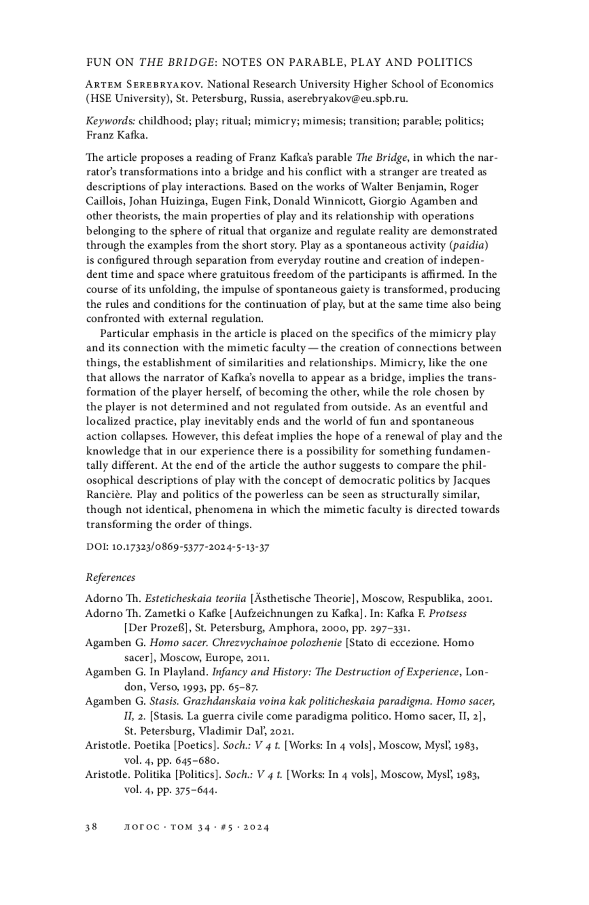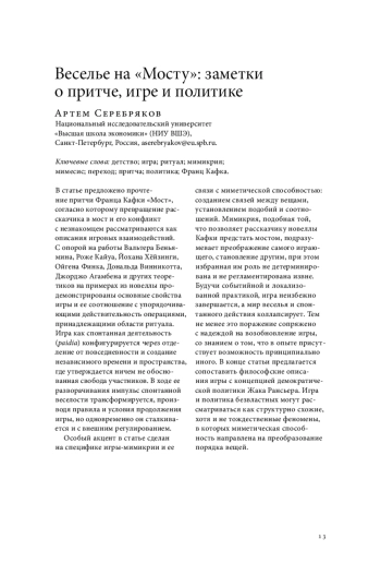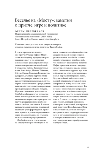 В статье предложено прочтение притчи Франца Кафки «Мост», согласно которому превращение рассказчика в мост и его конфликт с незнакомцем рассматриваются как описания игровых взаимодействий. С опорой на работы Вальтера Беньямина, Роже Кайуа, Йохана Хёйзинги, Ойгена Финка, Дональда Винникотта, Джорджо Агамбена и других теоретиков на примерах из новеллы продемонстрированы основные свойства игры и ее соотношение с упорядочивающими действительность операциями, принадлежащими области ритуала. Игра как спонтанная деятельность (paidia) конфигурируется через отделение от повседневности и создание независимого времени и пространства, где утверждается ничем не обоснованная свобода участников. В ходе ее разворачивания импульс спонтанной веселости трансформируется, производя правила и условия продолжения игры, но одновременно он сталкивается и с внешним регулированием. Особый акцент в статье сделан на специфике игры-мимикрии и ее связи с миметической способностью: созданием связей между вещами, установлением подобий и соотношений. Мимикрия, подобная той, что позволяет рассказчику новеллы Кафки предстать мостом, подразумевает преображение самого играющего, становление другим, при этом избранная им роль не детерминирована и не регламентирована извне. Будучи событийной и локализованной практикой, игра неизбежно завершается, а мир веселья и спонтанного действия коллапсирует. Тем не менее это поражение сопряжено с надеждой на возобновление игры, со знанием о том, что в опыте присутствует возможность принципиально иного. В конце статьи предлагается сопоставить философские описания игры с концепцией демократической политики Жака Рансьера. Игра и политика безвластных могут рассматриваться как структурно схожие, хотя и не тождественные феномены, в которых миметическая способность направлена на преобразование порядка вещей