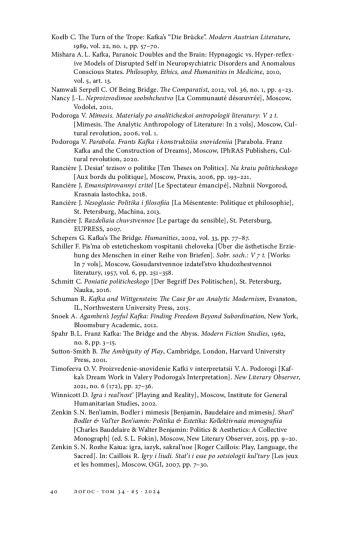 31. Тимофеева О. В. Произведение-сновидение Кафки в интерпретации В. А. Подороги // Новое литературное обозрение. 2021. № 6 (172). С. 27-36. EDN: FNSFPA