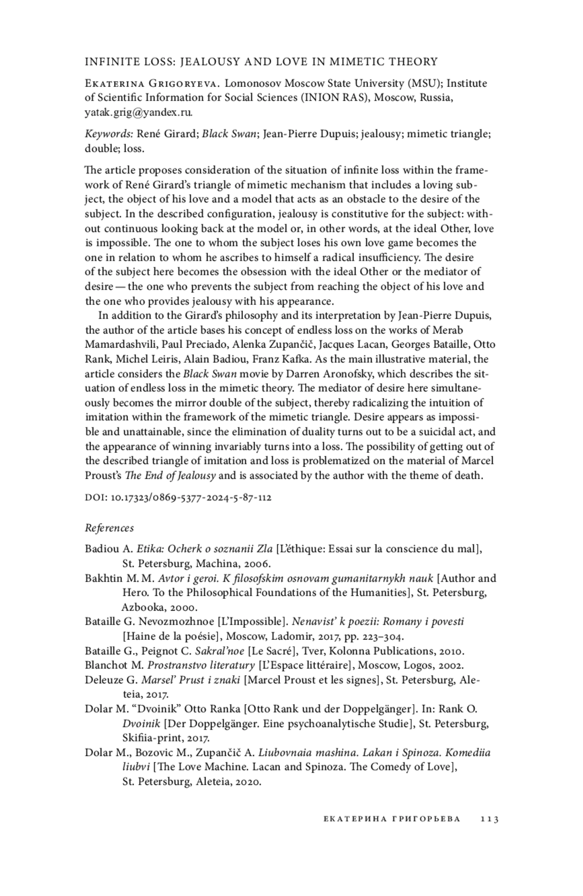 В статье рассматривается ситуация бесконечного проигрыша в рамках жираровского треугольника миметического желания, включающего любящего субъекта, объект этой любви и образец, который выступает в качестве препятствия на пути желания субъекта. В описанной конфигурации конститутивной для субъекта является ревность: вне непрерывной оглядки на образец или, иными словами, на идеального Другого, любовь не представляется возможной. Субъект проигрывает собственную любовную партию тому, в отношении кого приписывает себе радикальную недостаточность. Желанием субъекта здесь становится одержимость идеальным Другим или же медиатором желания — тем, кто мешает субъекту достичь объекта своей любви, и тем, кто обеспечивает своим появлением ревность. Помимо философии самого Рене Жирара и ее интерпретации ЖанПьером Дюпюи, автор статьи основывает свою концепцию бесконечного проигрыша на работах Мераба Мамардашвили, Поля Пресьядо, Аленки Зупанчич, Жака Лакана, Жоржа Батая, Отто Ранка, Мишеля Лейриса, Алена Бадью, Франца Кафки. В качестве основного иллюстративного материала в статье рассматривается фильм Даррена Аронофски «Черный лебедь», описывающий ситуацию бесконечного проигрыша в миметической теории. Медиатор желания здесь одновременно становится и зеркальным двойником субъекта, тем самым радикализируя интуицию подражания в рамках миметического треугольника. Желание предстает в виде невозможного и недостижимого, поскольку устранение раздвоенности оказывается самоубийственным актом, а видимость выигрыша неизменно оборачивается проигрышем. Возможность выхода из описанного треугольника подражания и проигрыша проблематизируется на материале «Конца ревности» Марселя Пруста и связывается автором с темой смерти