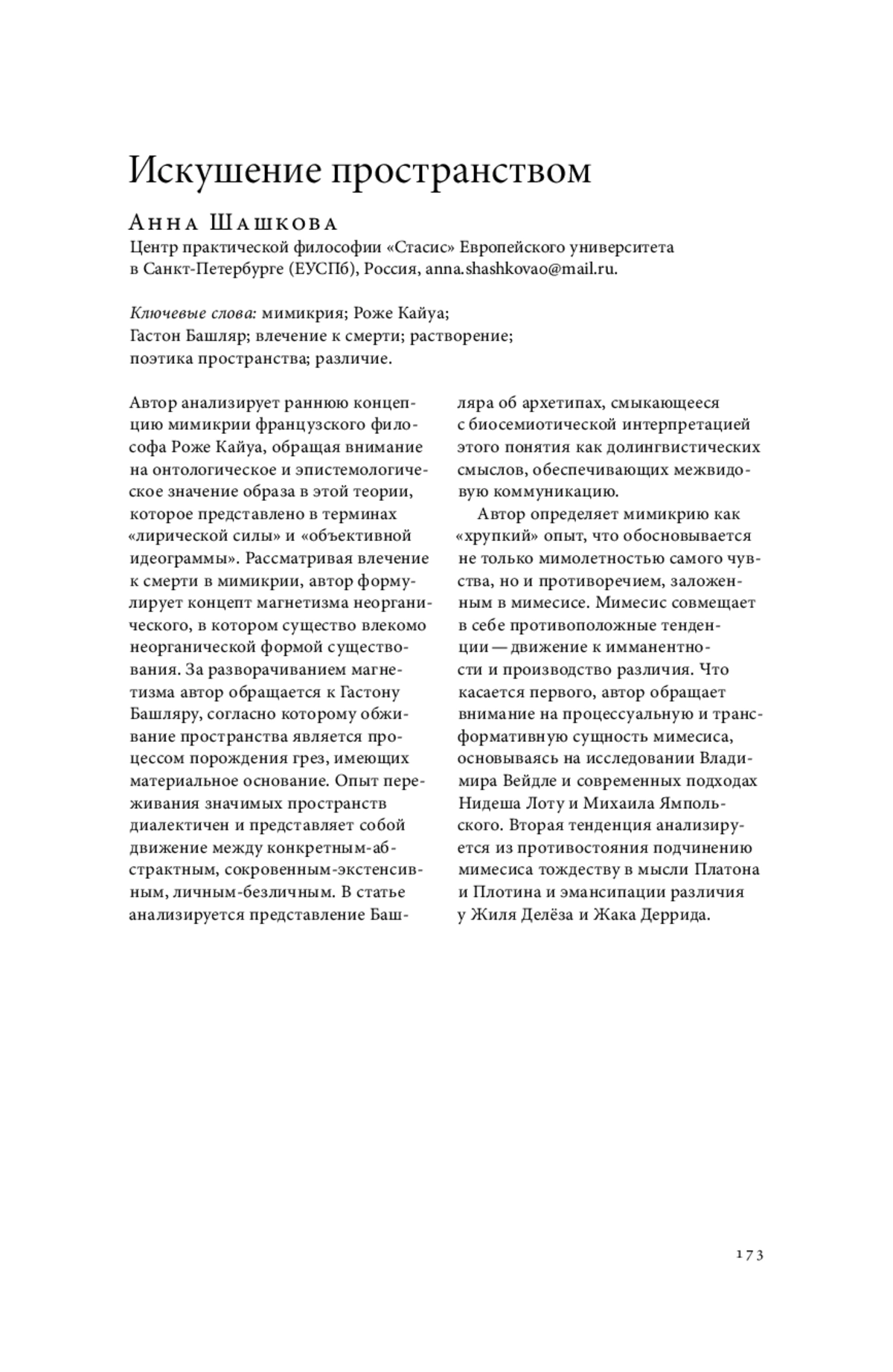 Автор анализирует раннюю концепцию мимикрии французского философа Роже Кайуа, обращая внимание на онтологическое и эпистемологическое значение образа в этой теории, которое представлено в терминах «лирической силы» и «объективной идеограммы». Рассматривая влечение к смерти в мимикрии, автор формулирует концепт магнетизма неорганического, в котором существо влекомо неорганической формой существования. За разворачиванием магнетизма автор обращается к Гастону Башляру, согласно которому обживание пространства является процессом порождения грез, имеющих материальное основание. Опыт переживания значимых пространств диалектичен и представляет собой движение между конкретным-абстрактным, сокровенным-экстенсивным, личным-безличным. В статье анализируется представление Башляра об архетипах, смыкающееся с биосемиотической интерпретацией этого понятия как долингвистических смыслов, обеспечивающих межвидовую коммуникацию. Автор определяет мимикрию как «хрупкий» опыт, что обосновывается не только мимолетностью самого чувства, но и противоречием, заложенным в мимесисе. Мимесис совмещает в себе противоположные тенденции — движение к имманентности и производство различия. Что касается первого, автор обращает внимание на процессуальную и трансформативную сущность мимесиса, основываясь на исследовании Владимира Вейдле и современных подходах Нидеша Лоту и Михаила Ямпольского. Вторая тенденция анализируется из противостояния подчинению мимесиса тождеству в мысли Платона и Плотина и эмансипации различия у Жиля Делёза и Жака Деррида.