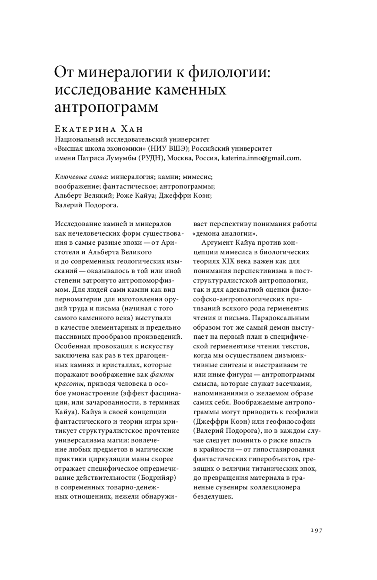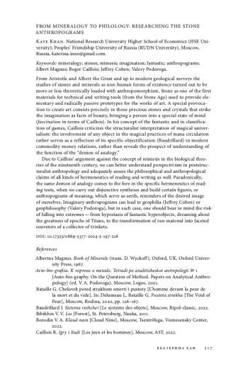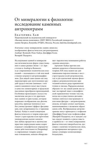 Исследование камней и минералов как нечеловеческих форм существования в самые разные эпохи — от Аристотеля и Альберта Великого и до современных геологических изысканий — оказывалось в той или иной степени затронуто антропоморфизмом. Для людей сами камни как вид первоматерии для изготовления орудий труда и письма (начиная с того самого каменного века) выступали в качестве элементарных и предельно пассивных прообразов произведений. Особенная провокация к искусству заключена как раз в тех драгоценных камнях и кристаллах, которые поражают воображение как факты красоты, приводя человека в особое умонастроение (эффект фасцинации, или зачарованности, в терминах Кайуа). Кайуа в своей концепции фантастического и теории игры критикует структуралистское прочтение универсализма магии: вовлечение любых предметов в магические практики циркуляции маны скорее отражает специфическое опредмечивание действительности (Бодрийяр) в современных товарно-денежных отношениях, нежели обнаруживает перспективу понимания работы «демона аналогии». Аргумент Кайуа против концепции мимесиса в биологических теориях XIX века важен как для понимания перспективизма в постструктуралистской антропологии, так и для адекватной оценки философско-антропологических притязаний всякого рода герменевтик чтения и письма. Парадоксальным образом тот же самый демон выступает на первый план в специфической герменевтике чтения текстов, когда мы осуществляем дизъюнктивные синтезы и выстраиваем те или иные фигуры — антропограммы смысла, которые служат засечками, напоминаниями о желаемом образе самих себя. Воображаемые антропограммы могут приводить к геофилии (Джеффри Коэн) или геофилософии (Валерий Подорога), но в каждом случае следует помнить о риске впасть в крайности — от гипостазирования фантастических гиперобъектов, грезящих о величии титанических эпох, до превращения материала в граненые сувениры коллекционера безделушек
