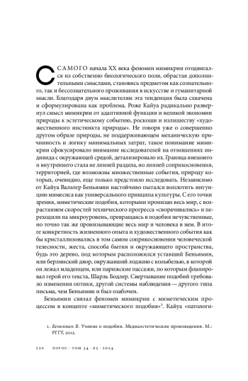 Автор анализирует раннюю концепцию мимикрии французского философа Роже Кайуа, обращая внимание на онтологическое и эпистемологическое значение образа в этой теории, которое представлено в терминах «лирической силы» и «объективной идеограммы». Рассматривая влечение к смерти в мимикрии, автор формулирует концепт магнетизма неорганического, в котором существо влекомо неорганической формой существования. За разворачиванием магнетизма автор обращается к Гастону Башляру, согласно которому обживание пространства является процессом порождения грез, имеющих материальное основание. Опыт переживания значимых пространств диалектичен и представляет собой движение между конкретным-абстрактным, сокровенным-экстенсивным, личным-безличным. В статье анализируется представление Башляра об архетипах, смыкающееся с биосемиотической интерпретацией этого понятия как долингвистических смыслов, обеспечивающих межвидовую коммуникацию. Автор определяет мимикрию как «хрупкий» опыт, что обосновывается не только мимолетностью самого чувства, но и противоречием, заложенным в мимесисе. Мимесис совмещает в себе противоположные тенденции — движение к имманентности и производство различия. Что касается первого, автор обращает внимание на процессуальную и трансформативную сущность мимесиса, основываясь на исследовании Владимира Вейдле и современных подходах Нидеша Лоту и Михаила Ямпольского. Вторая тенденция анализируется из противостояния подчинению мимесиса тождеству в мысли Платона и Плотина и эмансипации различия у Жиля Делёза и Жака Деррида.
