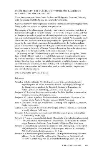 Аналитика феномена мимикрии и миметических процессов, выполненная в гуманитарной мысли в ХХ веке — в работах Роже Кайуа и Вальтера Беньямина, — дает основание для понимания мимикрии в антиадаптивной манере, как конфликтного отношения внутреннего и внешнего. Психоаналитическое изучение невротических и психотических структур указывает на значимость миметических процессов для внутренней жизни человека и связывает их с фундаментальными процессами интроекции и проекции, порождающими психическую реальность. Анализ этих процессов, представленный в работах Шандора Ференци, показывает, какие формы приобретает миметическая тенденция в формировании реальности психотика и невротика. В мимикрии выявляется двойная тенденция — воспринимать и уклоняться от восприятия. На материале работ Уилфреда Биона обнаруживается, что уклонение от восприятия предполагает активную деятельность по изоляции объекта, что приводит к заключению о невозможности этого уклонения в действительности. В опоре на исследования психических процессов и миметизма в данной статье делается попытка раскрыть драматическую парадоксальность мимикрии, связанную, с одной стороны, с тенденцией избыточности и погружения, а с другой — с тенденцией проникновения и контроля
