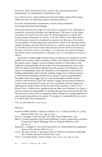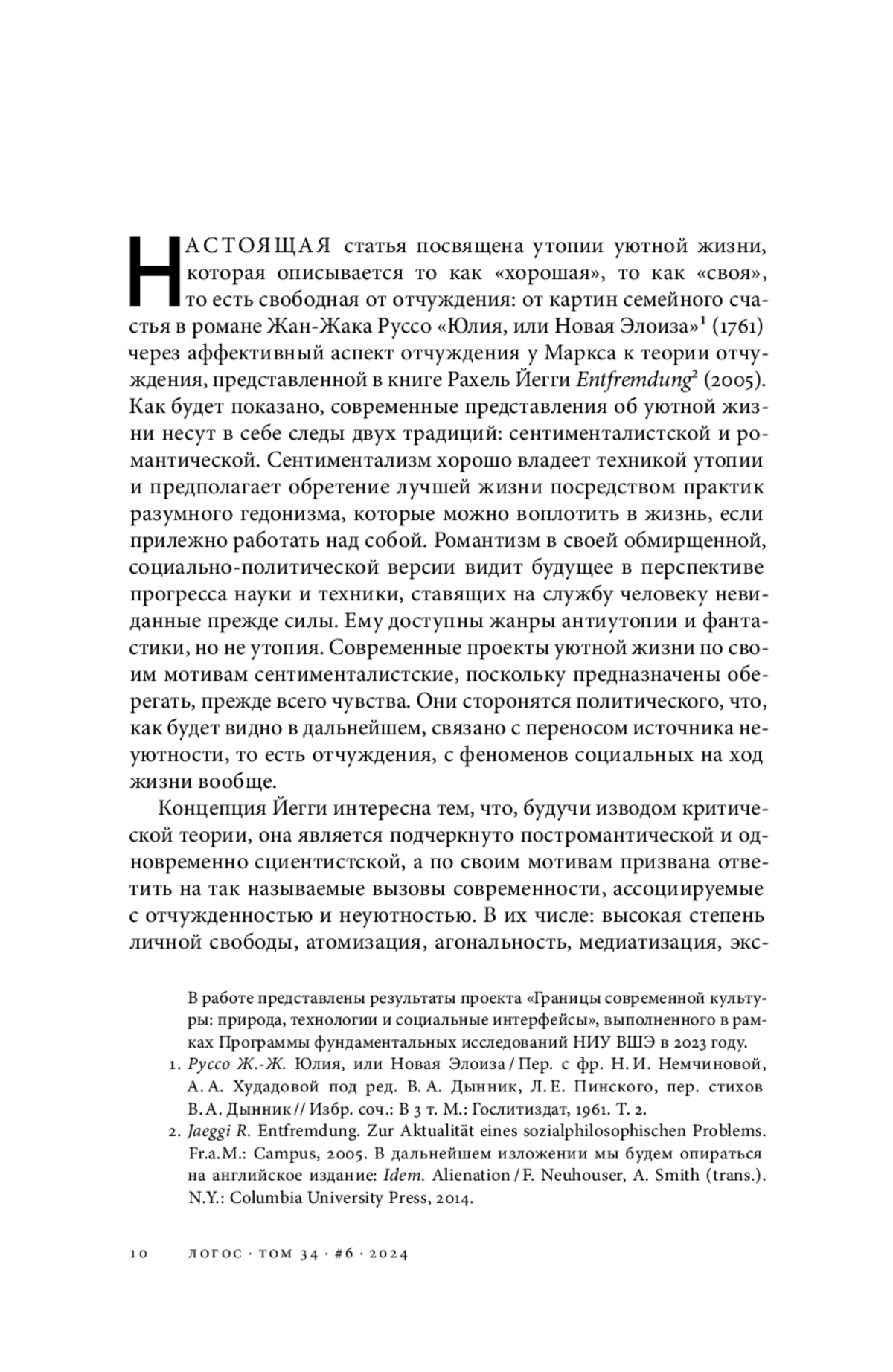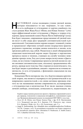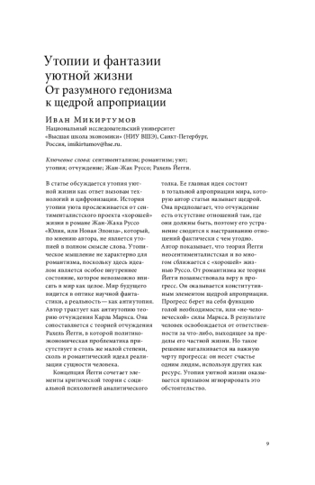 В статье обсуждается утопия уютной жизни как ответ вызовам технологий и цифровизации. История утопии уюта прослеживается от сентименталистского проекта «хорошей» жизни в романе Жан-Жака Руссо «Юлия, или Новая Элоиза», который, по мнению автора, не является утопией в полном смысле слова. Утопическое мышление не характерно для романтизма, поскольку здесь идеалом является особое внутреннее состояние, которое невозможно вписать в мир как целое. Мир будущего видится в оптике научной фантастики, а реальность — как антиутопия. Автор трактует как антиутопию теорию отчуждения Карла Маркса. Она сопоставляется с теорией отчуждения Рахель Йегги, в которой политикоэкономическая проблематика присутствует в столь же малой степени, сколь и романтический идеал реализации сущности человека. Концепция Йегги сочетает элементы критической теории с социальной психологией аналитического толка. Ее главная идея состоит в тотальной апроприации мира, которую автор статьи называет щедрой. Она предполагает, что отчуждение есть отсутствие отношений там, где они должны быть, поэтому его устранение сводится к выстраиванию отношений фактически с чем угодно. Автор показывает, что теория Йегги неосентименталистская и во многом сближается с «хорошей» жизнью Руссо. От романтизма же теория Йегги позаимствовала веру в прогресс. Он оказывается конститутивным элементом щедрой апроприации. Прогресс берет на себя функцию голой необходимости, или «не-человеческой» силы Маркса. В результате человек освобождается от ответственности за что-либо, выходящее за пределы его частной жизни. Но такое решение наталкивается на важную черту прогресса: он несет счастье одним людям, используя других как ресурс. Утопия уютной жизни оказывается призывом игнорировать это обстоятельство