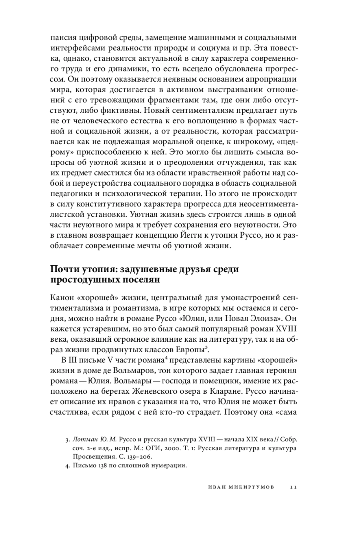 Настоящая статья посвящена утопии уютной жизни, которая описывается то как «хорошая», то как «своя», то есть свободная от отчуждения: от картин семейного счастья в романе Жан-Жака Руссо «Юлия, или Новая Элоиза»1 (1761) через аффективный аспект отчуждения у Маркса к теории отчуждения, представленной в книге Рахель Йегги Entfremdung2 (2005). Как будет показано, современные представления об уютной жизни несут в себе следы двух традиций: сентименталистской и романтической. Сентиментализм хорошо владеет техникой утопии и предполагает обретение лучшей жизни посредством практик разумного гедонизма, которые можно воплотить в жизнь, если прилежно работать над собой. Романтизм в своей обмирщенной, социально-политической версии видит будущее в перспективе прогресса науки и техники, ставящих на службу человеку невиданные прежде силы. Ему доступны жанры антиутопии и фантастики, но не утопия. Современные проекты уютной жизни по своим мотивам сентименталистские, поскольку предназначены оберегать, прежде всего чувства. Они сторонятся политического, что, как будет видно в дальнейшем, связано с переносом источника неуютности, то есть отчуждения, с феноменов социальных на ход жизни вообще.