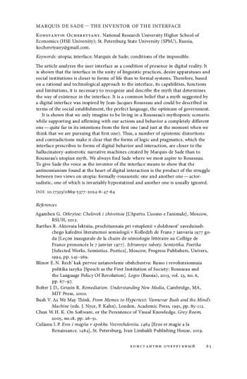 В статье анализируется пользовательский интерфейс как условие присутствия в цифровой реальности. Показано, что в единстве языковых практик, аппаратов желания и социальных институтов он ближе к формам жизни, чем к формальным системам, а потому в основании рационального и технологического подхода к интерфейсу, его возможностям, функциям и ограничениям следует распознать и описать миф, определяющий способ существования в интерфейсе. Обычно полагают, что это миф об общественном установлении, совершенном языке, оптимуме правления, поэтому мы стремимся проживать интерфейс в стиле, вдохновленном Жан-Жаком Руссо. Автор статьи демонстрирует, что мы лишь воображаем, будто проживаем один мифопоэтический сценарий, поддерживая и утверждая своими действиями и поведением совсем иной — далекий от первого (и как раз в тот момент, когда думаем, что преследуем первый). Так, ряд обнаруживаемых эпистемических искажений и противоречий дает увидеть, что логика и прагматика, которые интерфейс предписывает формам цифрового поведения и взаимодействия, по букве и исполнению ближе к галлюцинаторно-аутоэротическим машинам наррации, созданным маркизом де Садом, чем к утопическому мифу Руссо. Мы обнаруживаем де Сада там, где больше всего стремимся к Руссо. Дать слово де Саду в качестве изобретателя интерфейса означает показать, что антиномичность цифрового взаимодействия является продуктом борьбы двух взглядов на утопию — формально-руссоисткого и акторно-садисткого, — один из которых неизменно гипостазируется, а другой вытесняется