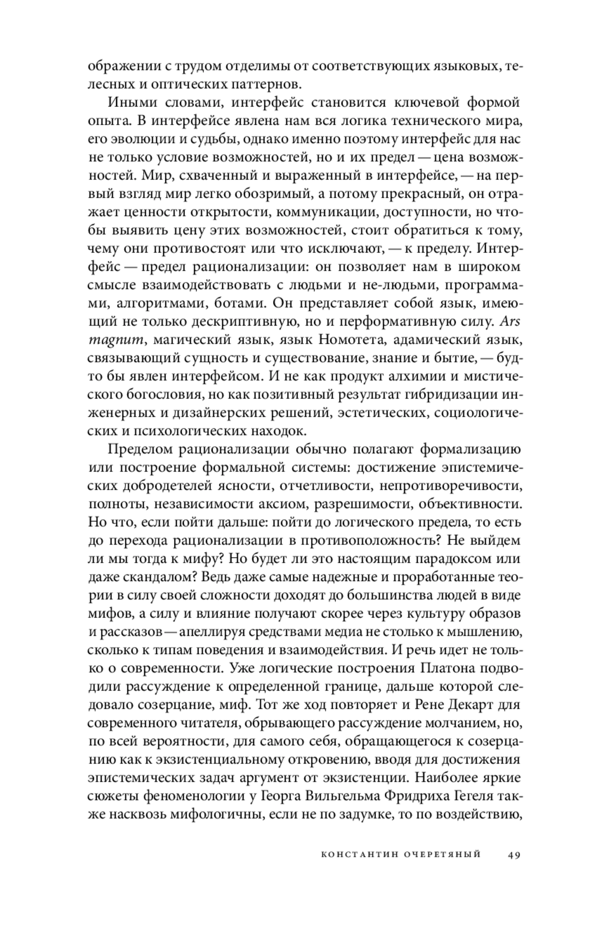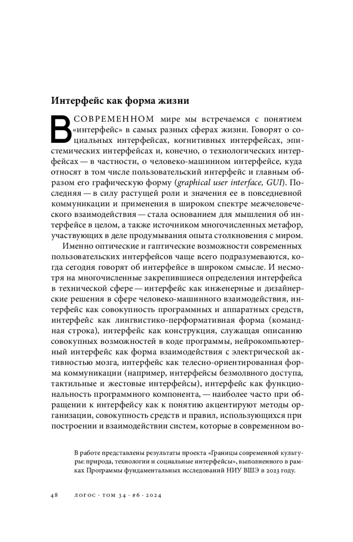 В современном мире мы встречаемся с понятием «интерфейс» в самых разных сферах жизни. Говорят о социальных интерфейсах, когнитивных интерфейсах, эпистемических интерфейсах и, конечно, о технологических интерфейсах — в частности, о человеко-машинном интерфейсе, куда относят в том числе пользовательский интерфейс и главным образом его графическую форму (graphical user interface, GUI). Последняя — в силу растущей роли и значения ее в повседневной коммуникации и применения в широком спектре межчеловеческого взаимодействия — стала основанием для мышления об интерфейсе в целом, а также источником многочисленных метафор, участвующих в деле продумывания опыта столкновения с миром