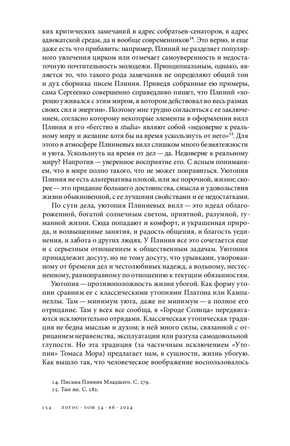 Описания вилл в письмах Плиния Младшего представляют своего рода утопию. В ее основе — идеал облагороженной и приятной жизни, ключевое место в которой занимают возвышенные литературные занятия. Для реализации этого идеала требуются вдохновляющее природное окружение и определенная степень уюта, но не обычные для римлян круга Плиния приметы роскоши: позолота, слоновая кость, дорогие статуи. Описание Плинием своих вилл — это и не рассказ о статусе, общественном влиянии, будь то в политических или литературных кругах: его жизнь на виллах предполагает временное удаление и от бремени, и от дивидендов общественных обязанностей, сосредоточение на занятиях, чередуемых с отдыхом, при этом речь не идет об эскапизме. Жизненный идеал, выступающий за тем, как Плиний описывает свои виллы, органично соотносится с его темпераментом и мировоззрением, какими они проявляются в письмах, не имеющих отношения к загородному времяпрепровождению. Как в описании вилл Плиний ничем не кичится, ни с кем не спорит, так и на пространстве всего сборника писем он выступает благожелательным, толерантным, дельным, заботливым человеком, обладающим при этом твердыми убеждениями. У(ю)топия Плиниевых вилл не является проектом коллективного переустройства, однако это — разработанный идеал, открытый для всех. Гуманизм Плиния удивительным образом предвосхищает гуманизм Нового времени