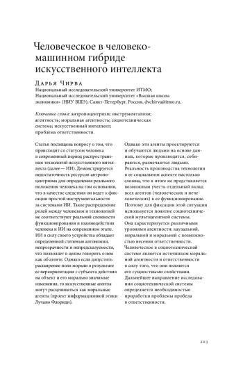 Статья посвящена вопросу о том, что происходит со статусом человека в современный период распространения технологий искусственного интеллекта (далее — ИИ). Демонстрируется недостаточность ресурсов антропоцентризма для определения реального положения человека на том основании, что в качестве следствия он ведет к фиксации простой инструментальности за системами ИИ. Такое распределение ролей между человеком и технологией не соответствуют реальной сложности функционирования и взаимодействия человека и ИИ на современном этапе. ИИ в силу своего устройства обладает определенной степенью автономии, непрозрачности и непредсказуемости, что позволяет в целом говорить о нем как об агенте. Однако если допустить расширение поля морали в результате ее переориентации с субъекта действия на объект и его морально значимые изменения, то искусственные агенты могут расцениваться как моральные агенты (проект информационной этики Лучано Флориди). Однако эти агенты проектируются и обучаются людьми на основе данных, которые производятся, собираются, размечаются людьми. Реальность производства технологии в ее социальном аспекте настолько сложна, что в итоге не представляется возможным учесть отдельный вклад всех агентов (человеческих и нечеловеческих) в ее функционирование. Поэтому для фиксации этой ситуации используется понятие социотехнической мультиагентной системы. Она характеризуется различными уровнями агентности: каузальной, моральной и моральной с возможностью несения ответственности. Человеческое в социотехнической системе является источником моральной агентности и ответственности в силу того, что они являются его сущностными свойствами. Дальнейшее направление исследования социотехнической системы определяется необходимостью проработки проблемы пробела в ответственности
