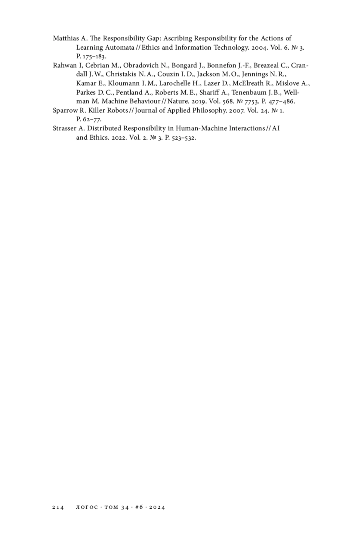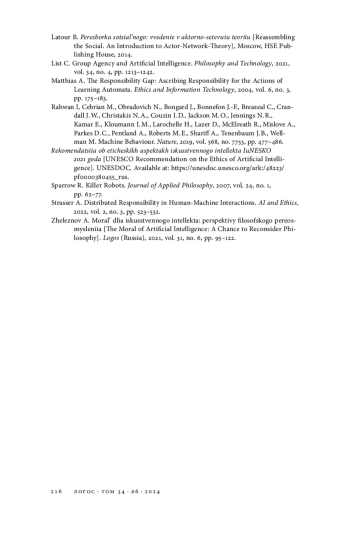 14. Strasser A. Distributed Responsibility in Human-Machine Interactions // AI and Ethics. 2022. Vol. 2. № 3. P. 523-532. EDN: JCKMKH