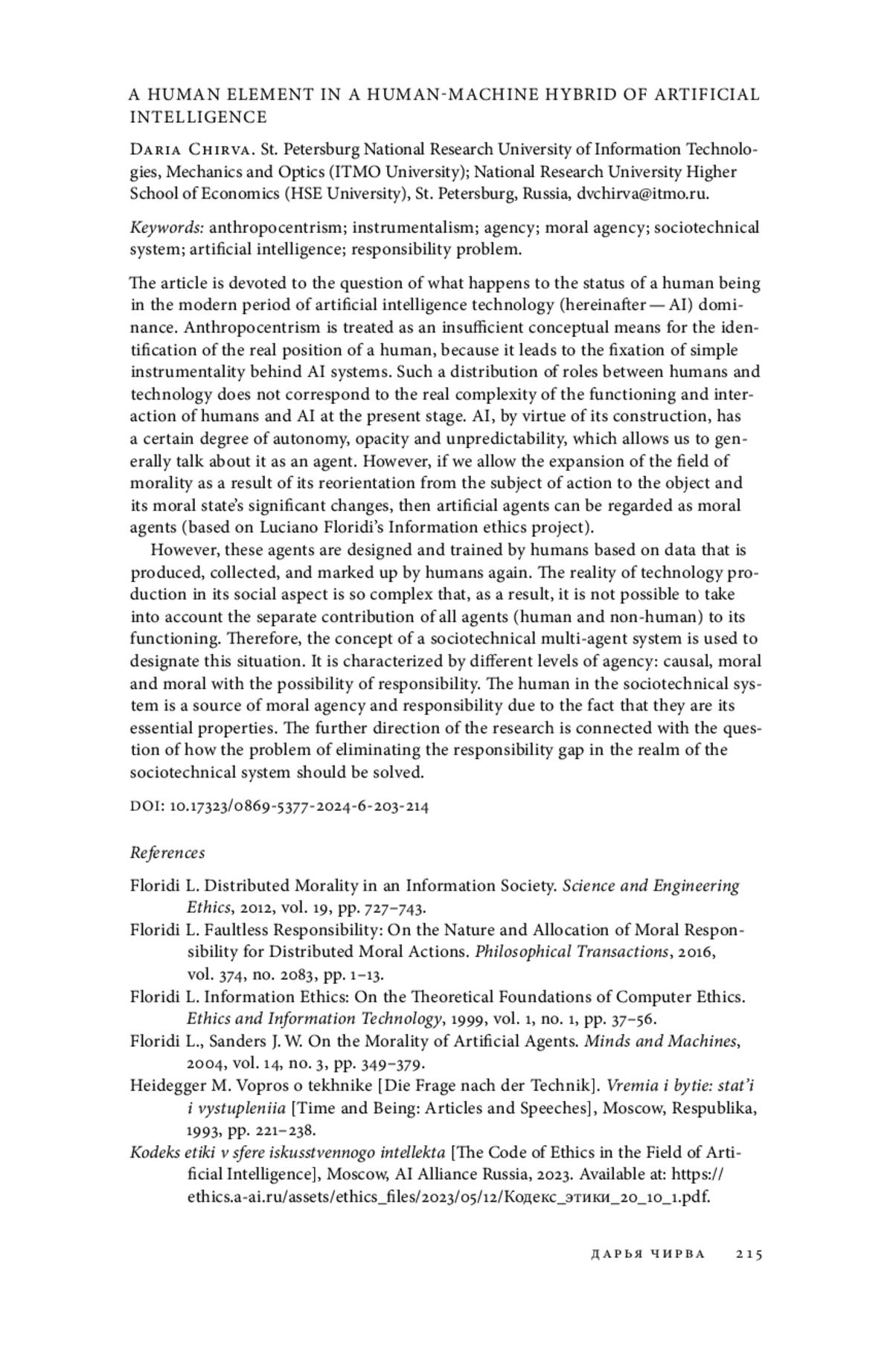 6. Floridi L. Distributed Morality in an Information Society // Science and Engineering Ethics. 2012. Vol. 19. P. 727-743.