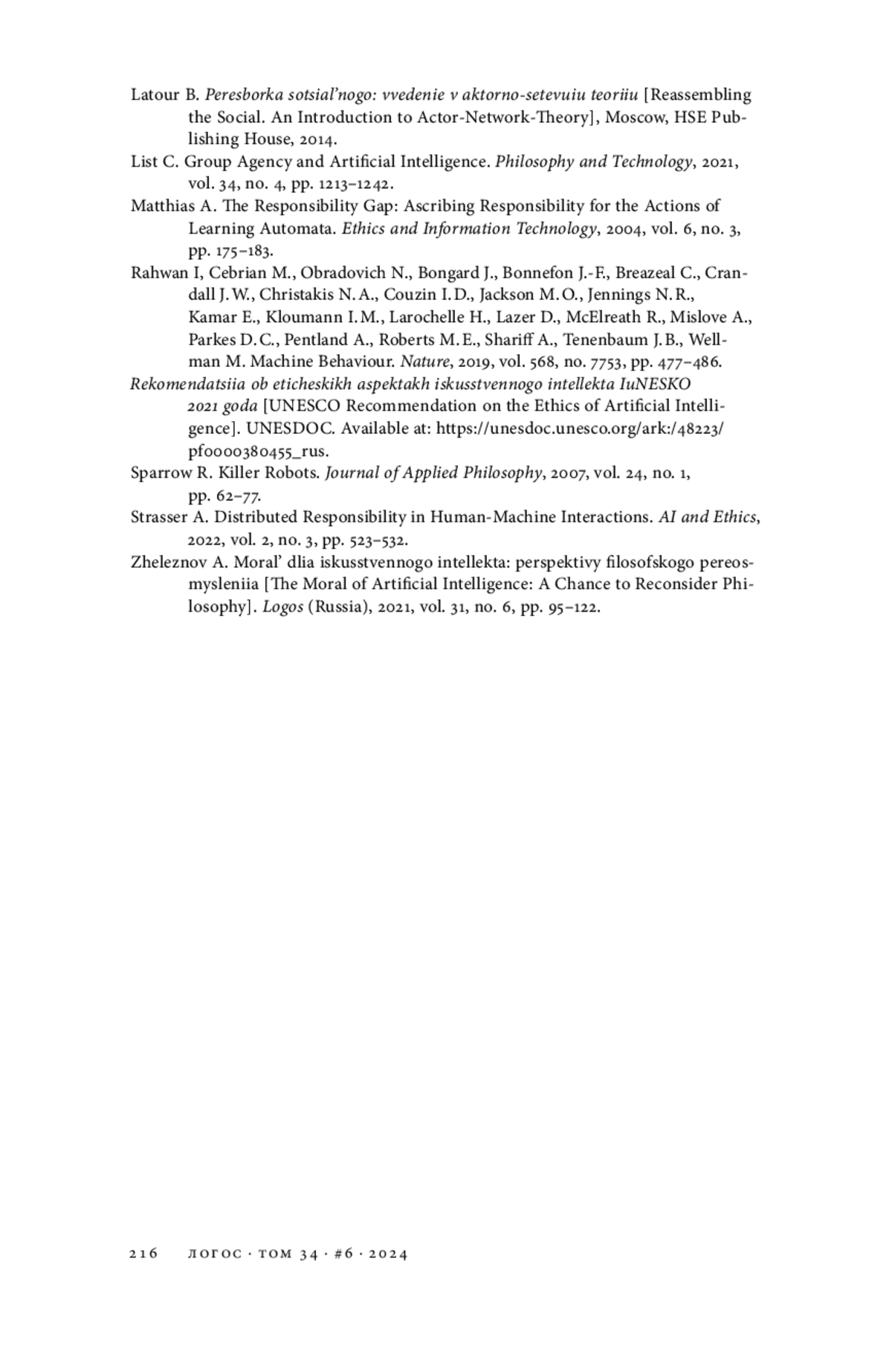 1. Железнов А. Мораль для искусственного интеллекта: перспективы философского переосмысления // Логос. 2021. Т. 31. № 6. С. 95-122. EDN: FYAPNI