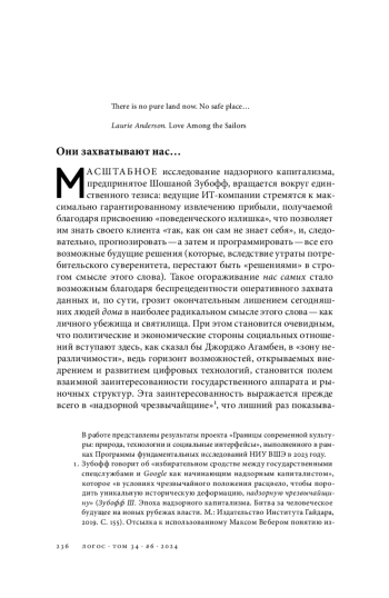 Масштабное исследование надзорного капитализма, предпринятое Шошаной Зубофф, вращается вокруг единственного тезиса: ведущие ИТ-компании стремятся к максимально гарантированному извлечению прибыли, получаемой благодаря присвоению «поведенческого излишка», что позволяет им знать своего клиента «так, как он сам не знает себя», и, следовательно, прогнозировать — а затем и программировать — все его возможные будущие решения (которые, вследствие утраты потребительского суверенитета, перестают быть «решениями» в строгом смысле этого слова). Такое огораживание нас самих стало возможным благодаря беспрецедентности оперативного захвата данных и, по сути, грозит окончательным лишением сегодняшних людей дома в наиболее радикальном смысле этого слова — как личного убежища и святилища.