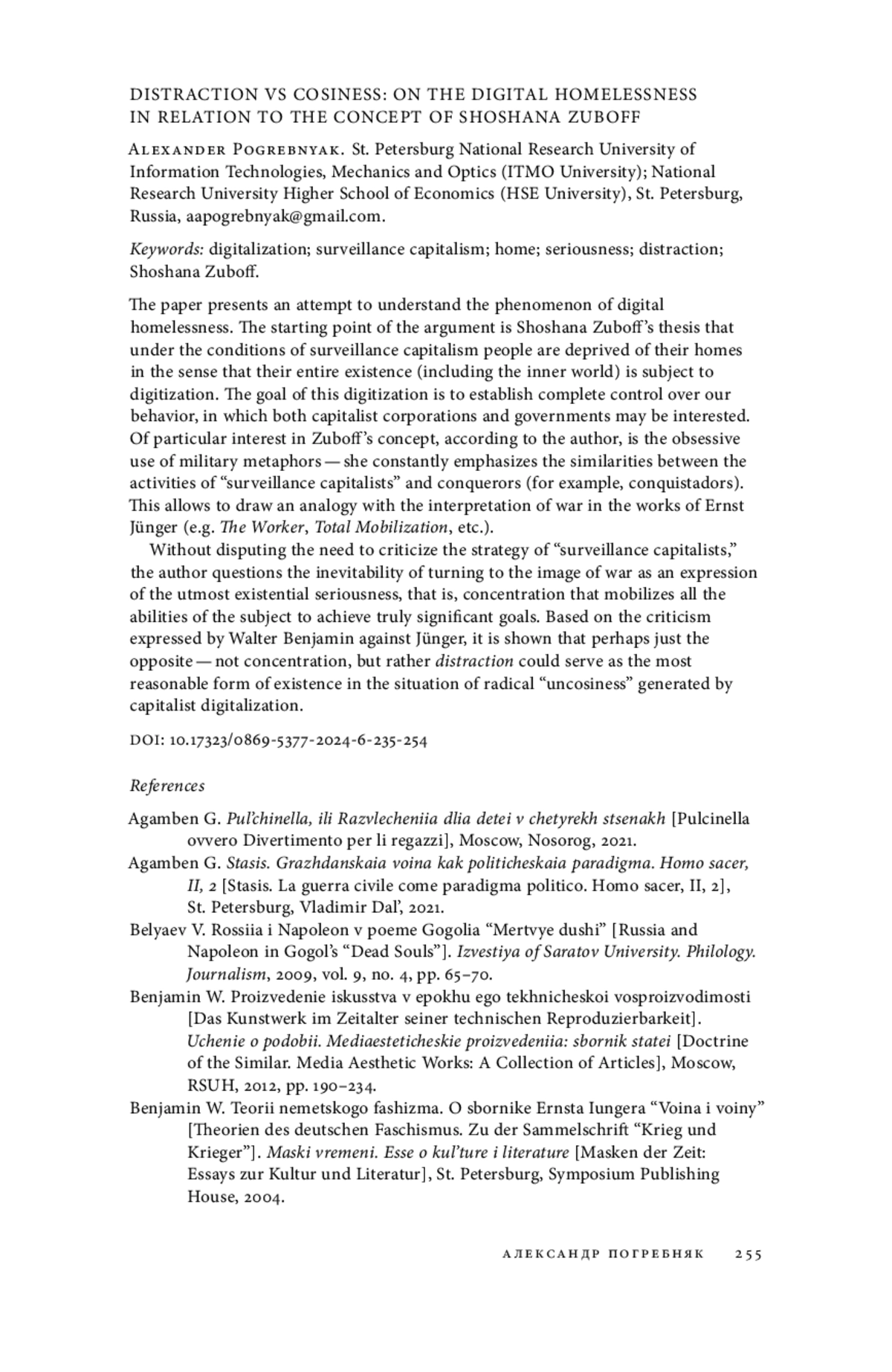 Статья посвящена осмыслению цифровой бездомности. Исходным пунктом рассуждений автора выступает тезис Шошаны Зубофф о том, что в условиях надзорного капитализма люди лишаются дома в том смысле, что их существование целиком (включая внутренний мир) подвергается оцифровке. Цель этой оцифровки — достижение полного контроля над нашим поведением, в котором могут быть заинтересованы как капиталистические корпорации, так и правительства. Особый интерес в концепции Зубофф, по мнению автора, представляет навязчивое использование военной метафорики: она постоянно подчеркивает сходство между деятельностью надзорных капиталистов и завоевателей (например, конкистадоров). Это позволяет провести аналогию с трактовкой войны в работах Эрнста Юнгера (таких как «Рабочий», «Тотальная мобилизация» и др.). Не оспаривая необходимости критиковать образ действий надзорных капиталистов, автор ставит под вопрос неизбежность обращения к образу войны как выражению предельной экзистенциальной серьезности, сосредоточенности, мобилизующей все способности субъекта для достижения подлинно значимых целей. Отталкиваясь от критики, высказанной Вальтером Беньямином в адрес Юнгера, автор показывает, что, возможно, как раз напротив — не сосредоточенность, а именно рассеянность могла бы послужить наиболее разумной формой существования в ситуации радикальной неуютности, порожденной капиталистической цифровизацией