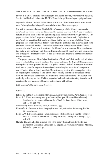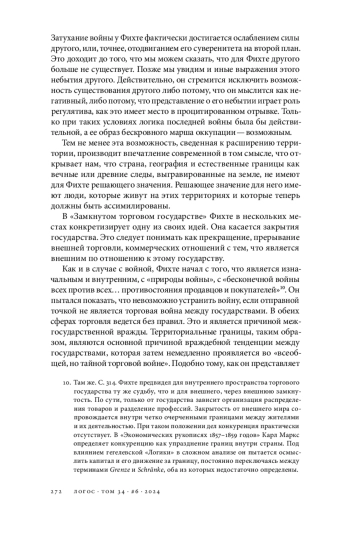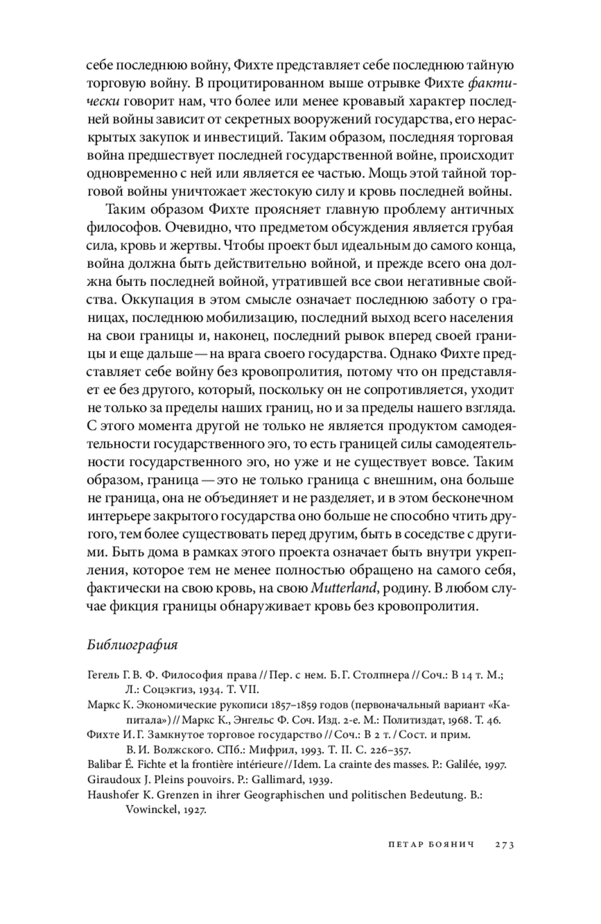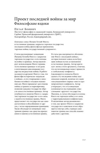 Статья рассматривает концепцию Иоганна Готлиба Фихте о «закрытом торговом государстве» и его взгляды на войну и границы. Автор анализирует использование Фихте термина «естественные границы» и его роль в легитимации консолидации государства посредством войны. В работе исследуется аргумент Фихте о том, что философы исторически «вздыхали о войнах», и его утверждение о неизбежности войны в текущем положении дел. Фихте предлагает для отмены войны устранить ее первопричину, позволив каждому государству обрести свои естественные границы. Автор углубляется в понятие Фихте о «закрытом торговом государстве» и его связь с идеей естественных границ. Фихте представляет это государство как самодостаточное и обособленное от других, с четко определенными границами. Также обсуждается концепция «внутренних границ» как средства преодоления и замены естественных границ. В статье рассматривается обоснование Фихте «последней войны», которая положит конец всем будущим войнам путем установления естественных границ. Автор критикует логику этого аргумента, отмечая, что он потенциально может привести к глобальному конфликту. Анализируется попытка Фихте сделать эту последнюю войну максимально мирной, включая его идею «оккупационного марша» вместо кровопролитного конфликта. Автор утверждает, что эта концепция основывается на отрицании существования «другого» государства. Наконец, в статье обсуждается взгляд Фихте на торговую войну и ее связь с территориальными конфликтами. В заключение автор размышляет о том, как проект Фихте о закрытом государстве в конечном итоге обращается внутрь себя, отрицая само понятие границ как способа взаимодействия с другими