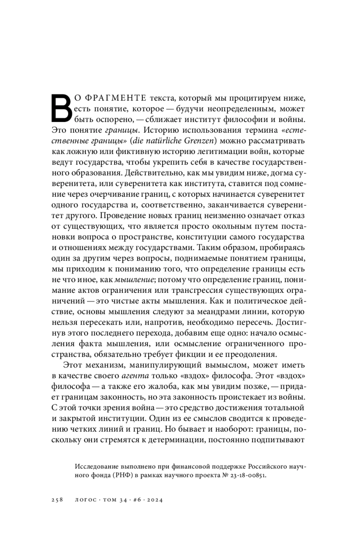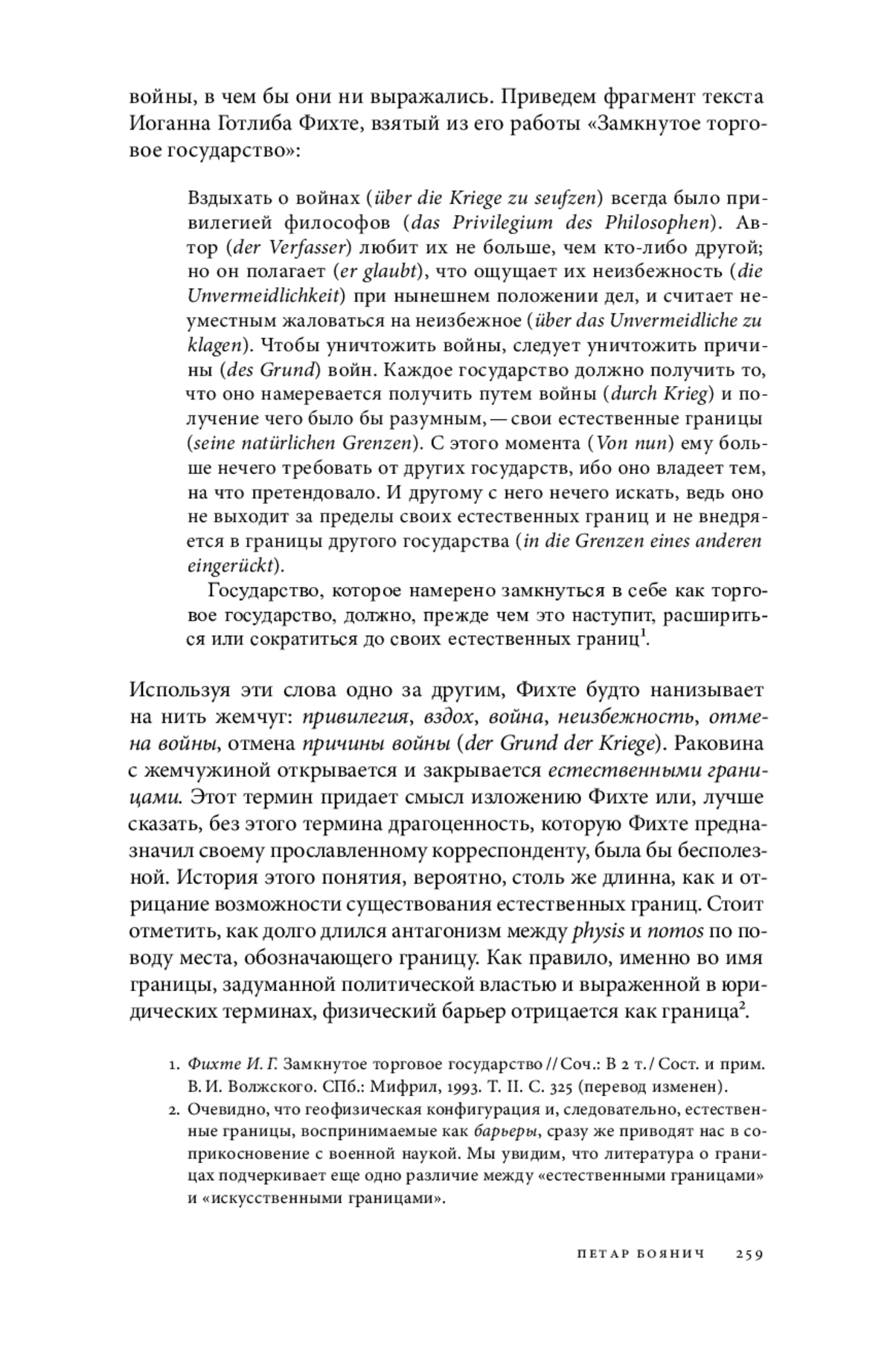 Во фрагменте текста, который мы процитируем ниже, есть понятие, которое — будучи неопределенным, может быть оспорено, — сближает институт философии и войны. Это понятие границы. Историю использования термина «естественные границы» (die natürliche Grenzen) можно рассматривать как ложную или фиктивную историю легитимации войн, которые ведут государства, чтобы укрепить себя в качестве государственного образования. Действительно, как мы увидим ниже, догма суверенитета, или суверенитета как института, ставится под сомнение через очерчивание границ, с которых начинается суверенитет одного государства и, соответственно, заканчивается суверенитет другого. Проведение новых границ неизменно означает отказ от существующих, что является просто окольным путем постановки вопроса о пространстве, конституции самого государства и отношениях между государствами.