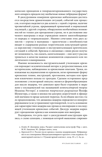 Одной из основных характеристик модерна является лежащий в его основании парадокс, который кратко можно было бы обозначить как установку на секьюритизацию через катастрофу. Иначе говоря, с одной стороны, наблюдается глубокое проникновение озабоченности безопасностью в политику, экономику, культуру и другие сферы человеческой жизнедеятельности, с другой стороны, обретает все большую убедительность взгляд на кризис и катастрофическую динамику как на диспозитив развития и модернизации, как на инструмент установления более прочного порядка, когда кризис описывается как начальная фаза нормализации или адаптации к инновациям, которые питают гибельные катаклизмы.